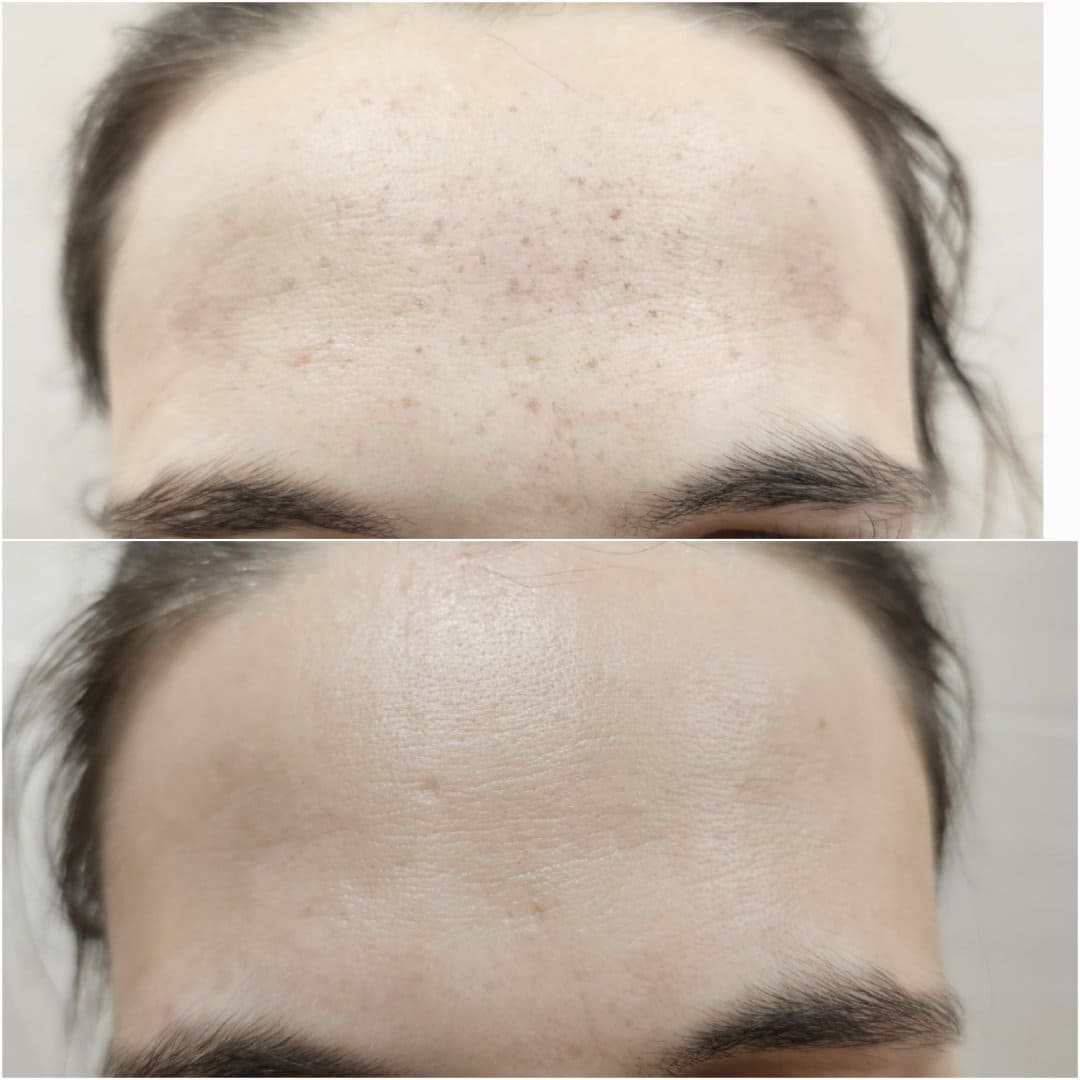 - Устранение пигментации: избавление от мелких и крупных пигментных пятен (первые исчезают после первого сеанса), веснушек; осветление постакне.