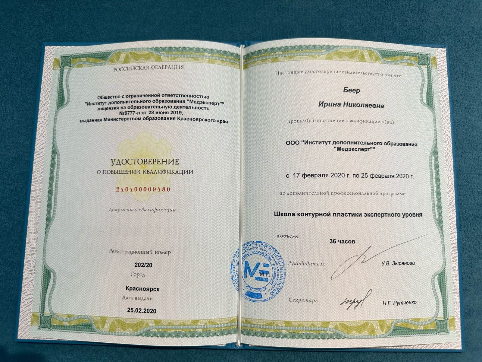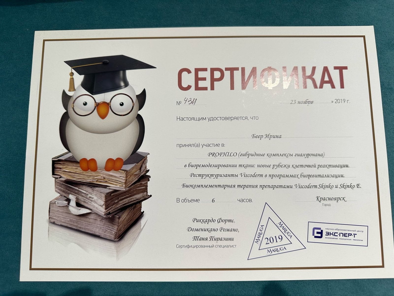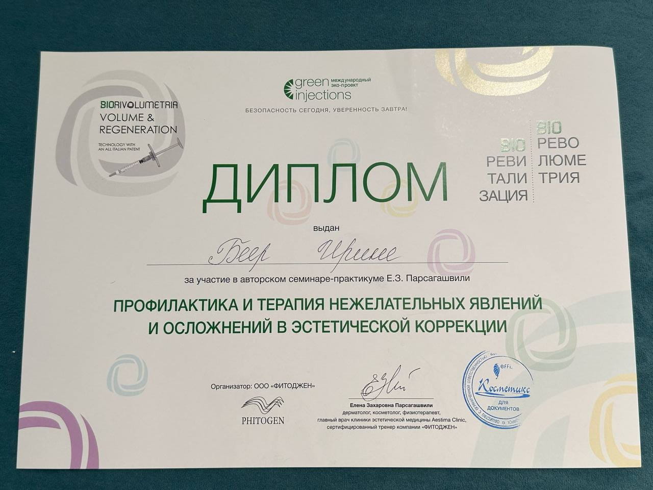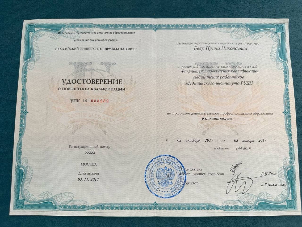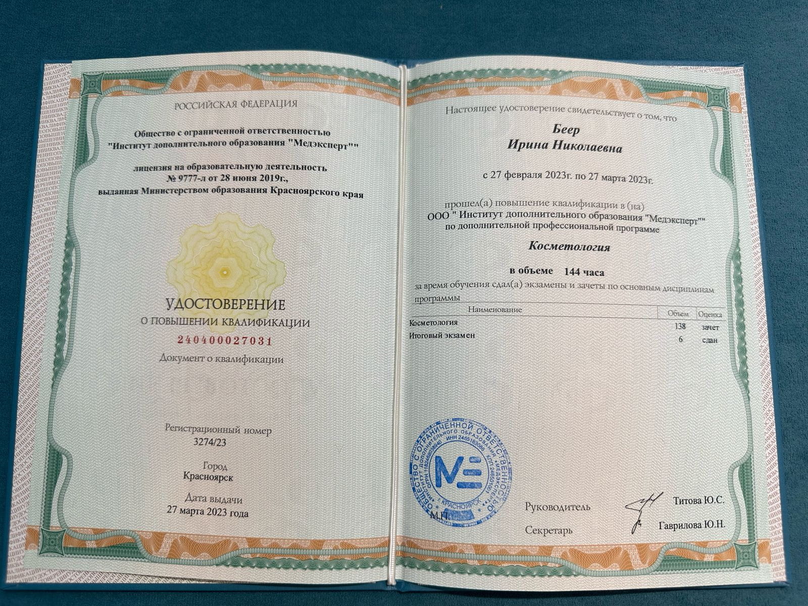 - "Косметология" , уникальный номер реестровой записи 7723 027475364 , место проведения ФГБОУ ДПО РМАНПО Минздрава России, срок действия 25.04.2028