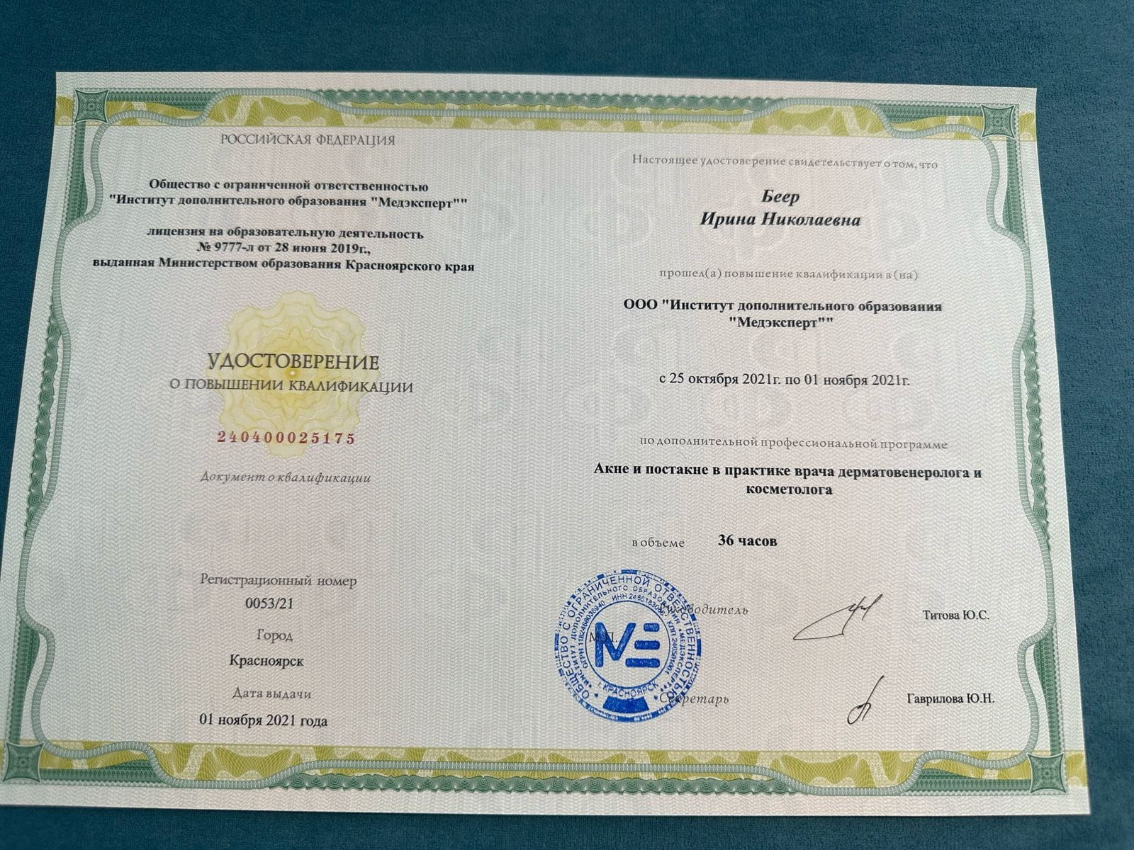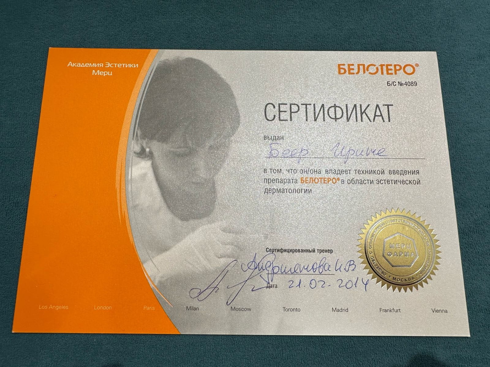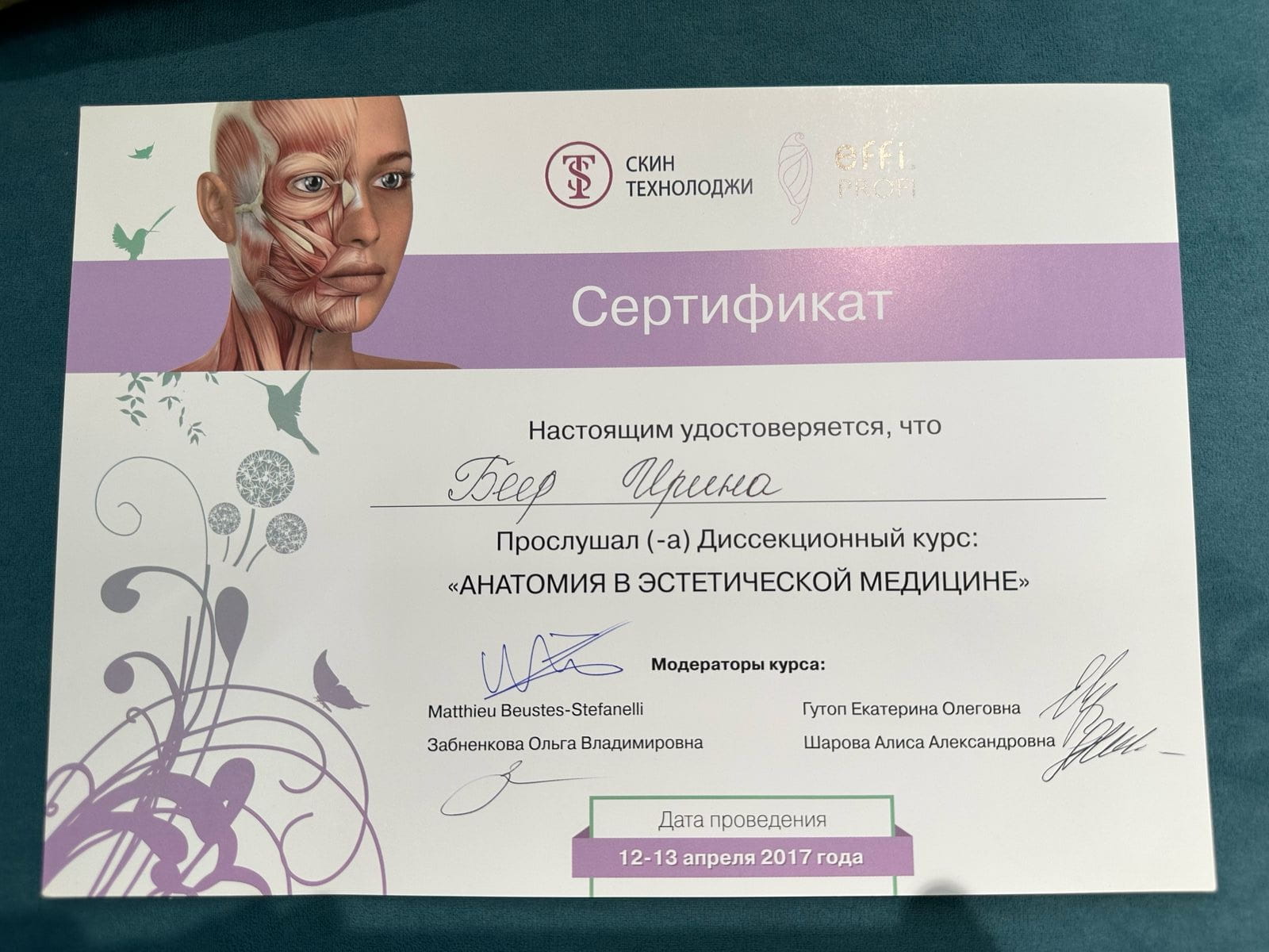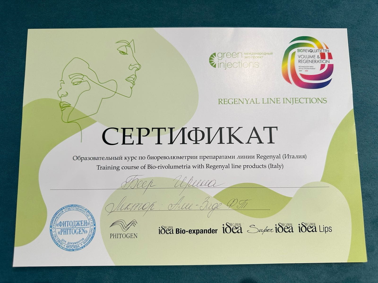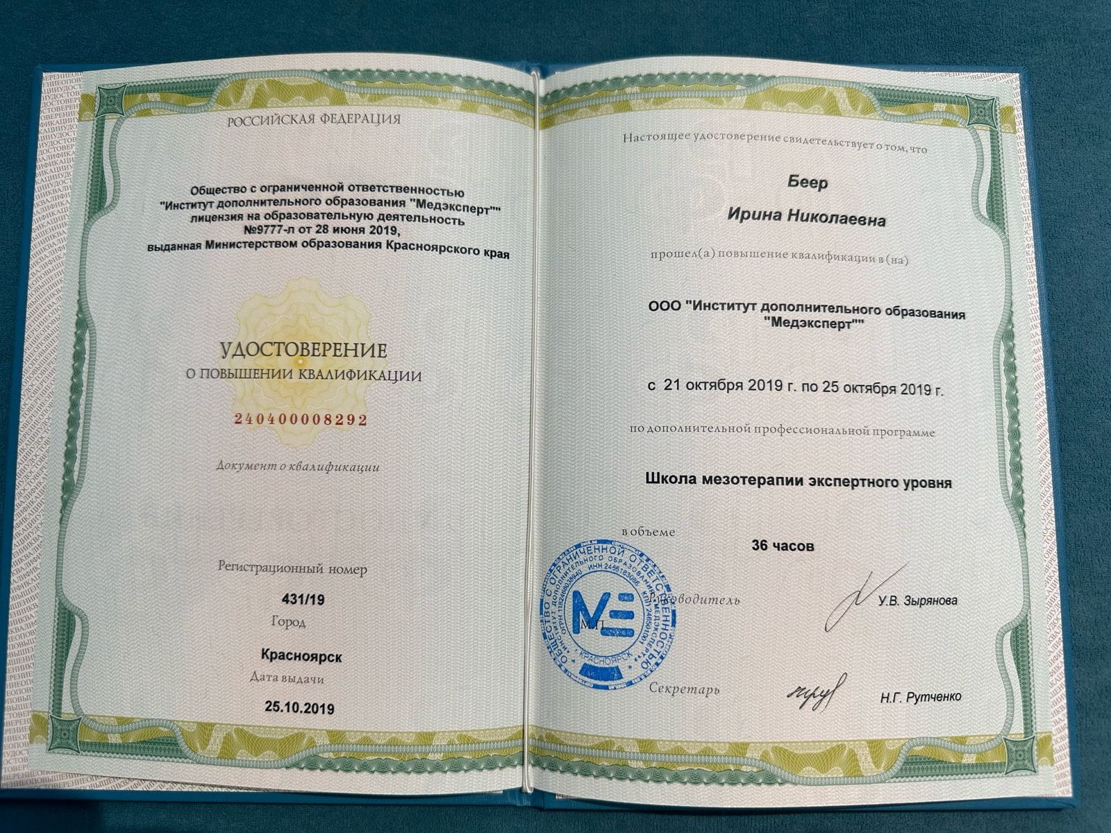 - "Косметология" , уникальный номер реестровой записи 7723 027475364 , место проведения ФГБОУ ДПО РМАНПО Минздрава России, срок действия 25.04.2028