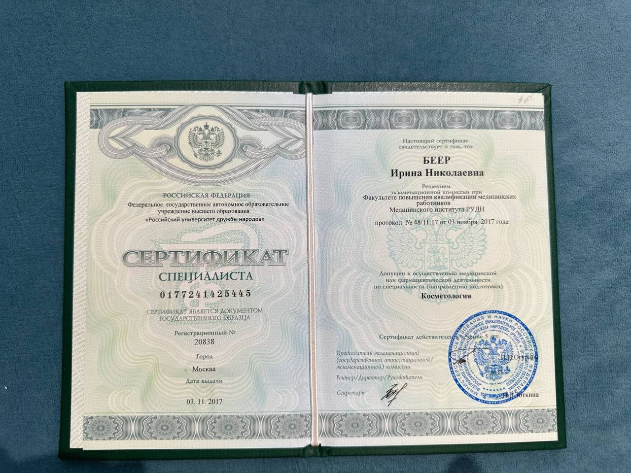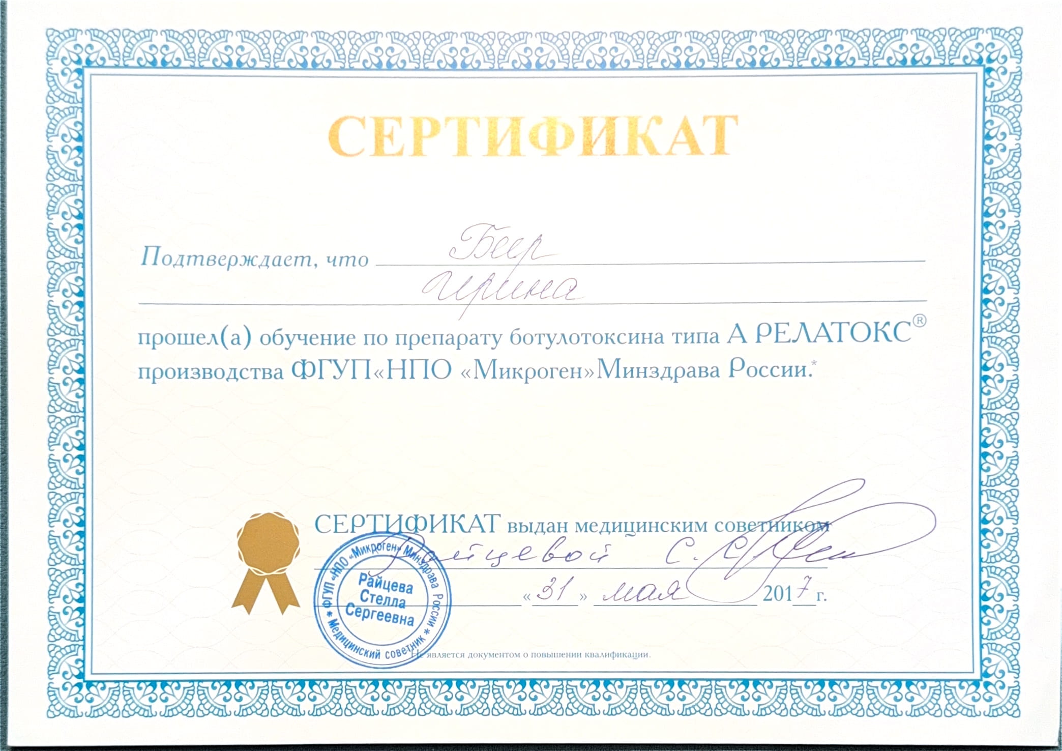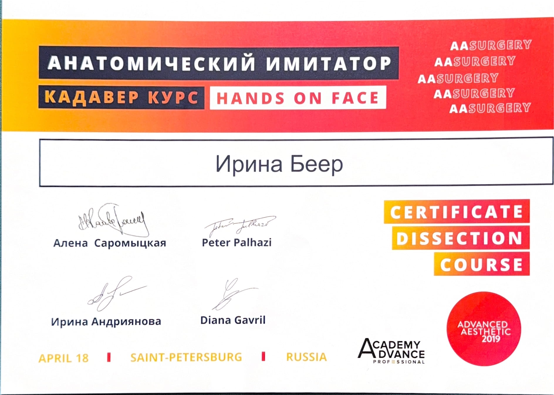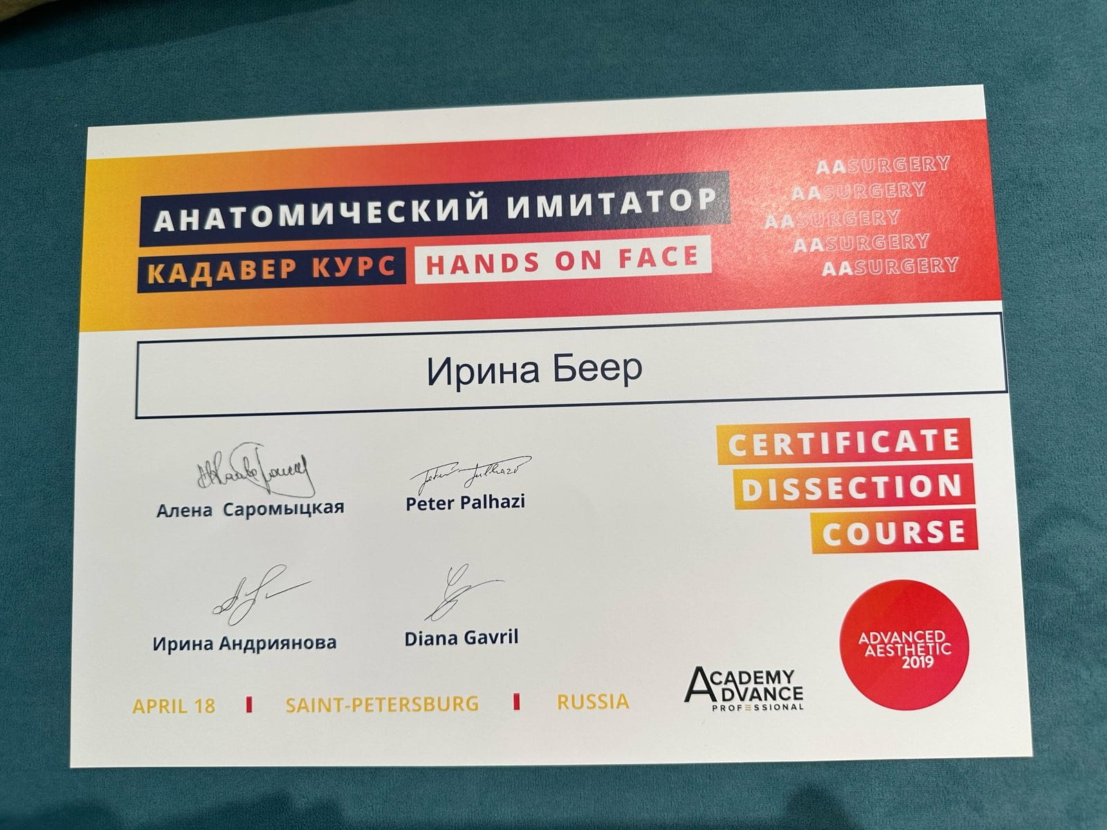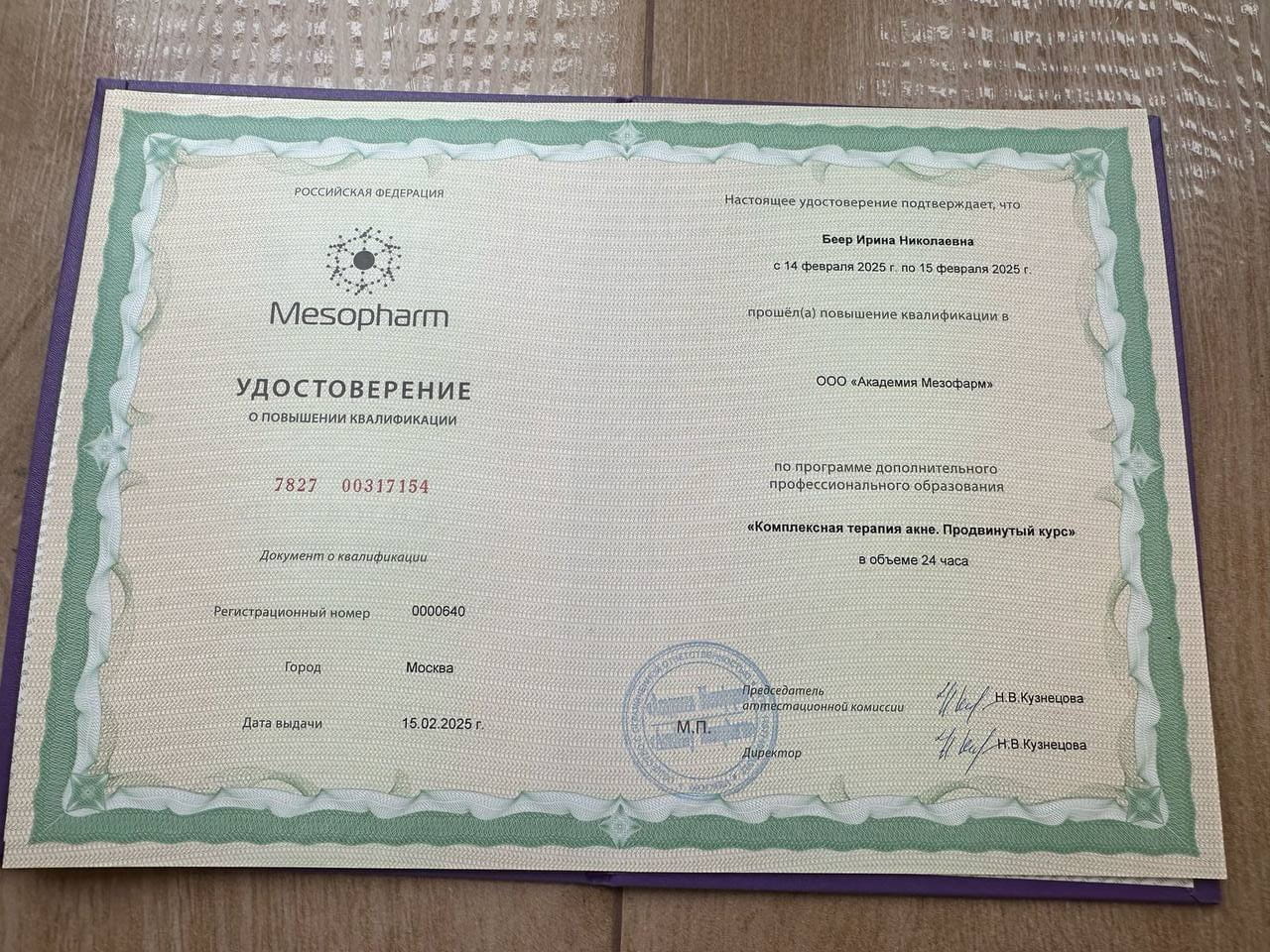 - "Косметология" , уникальный номер реестровой записи 7723 027475364 , место проведения ФГБОУ ДПО РМАНПО Минздрава России, срок действия 25.04.2028