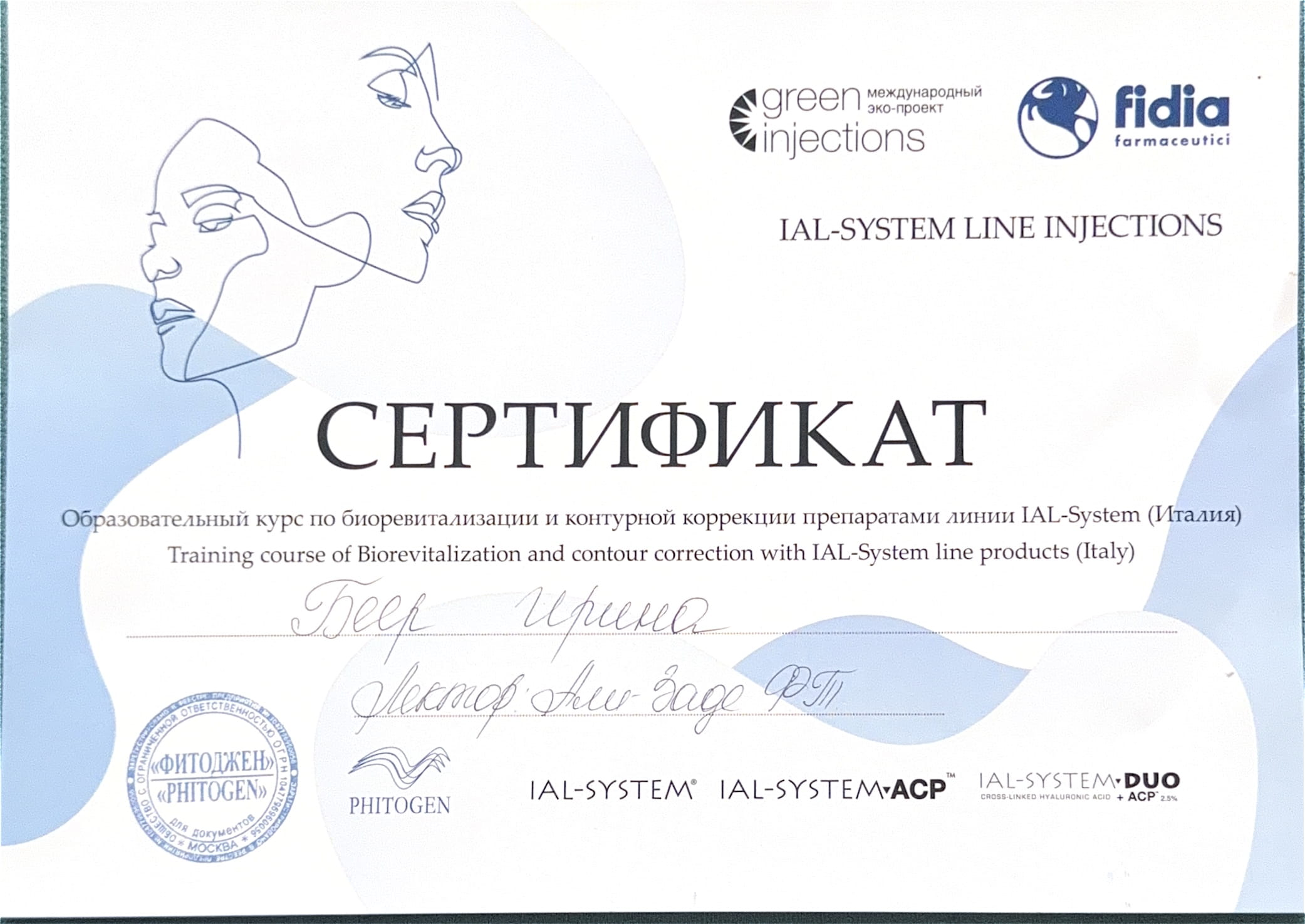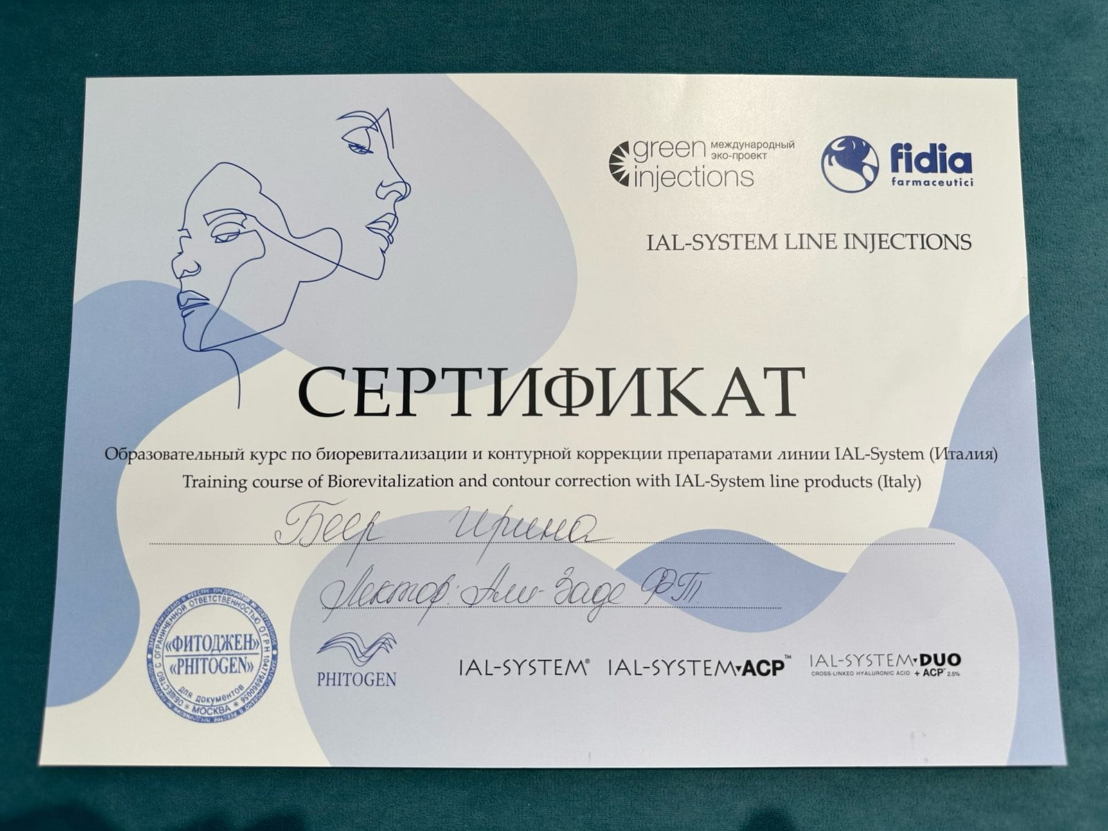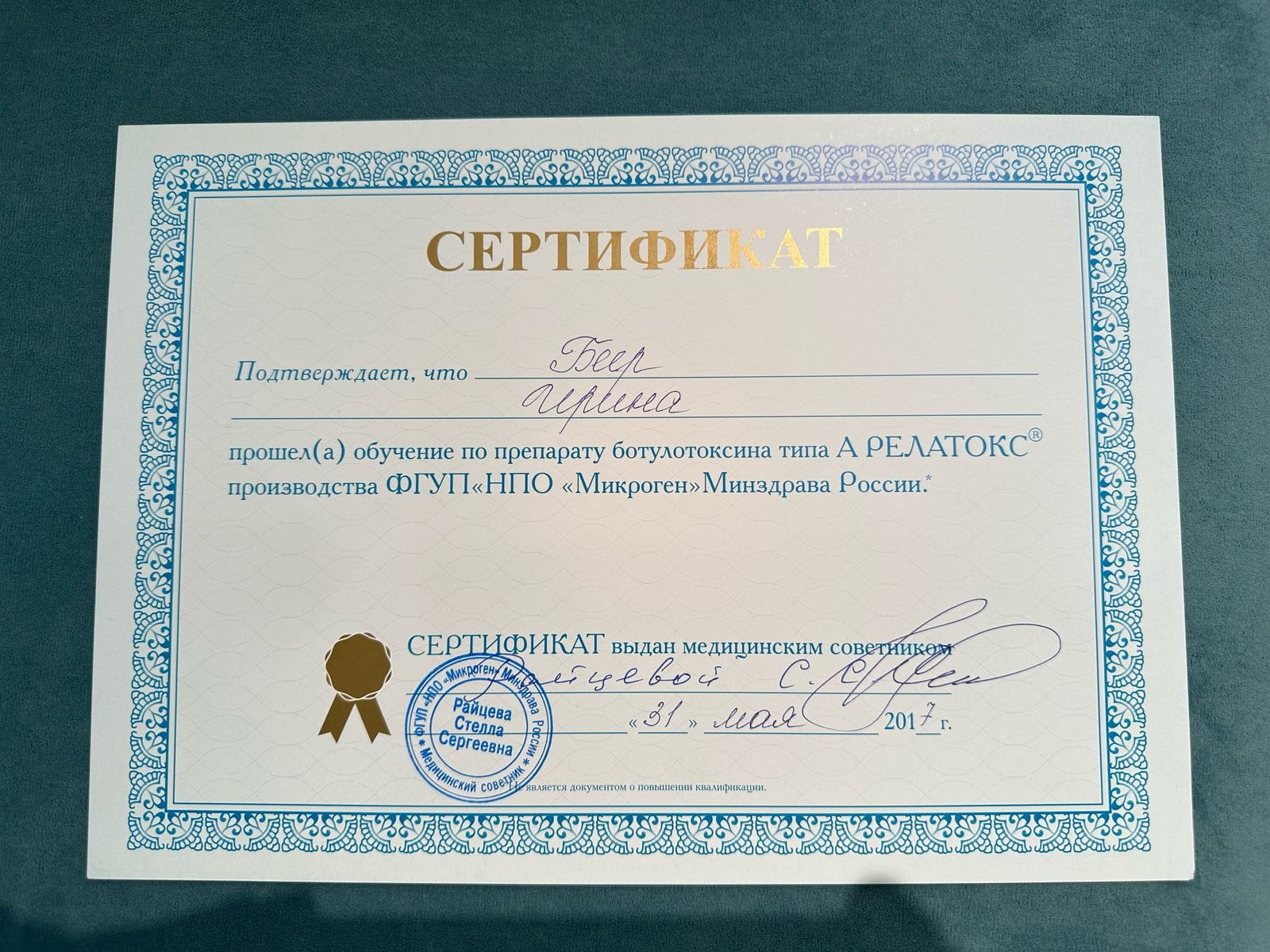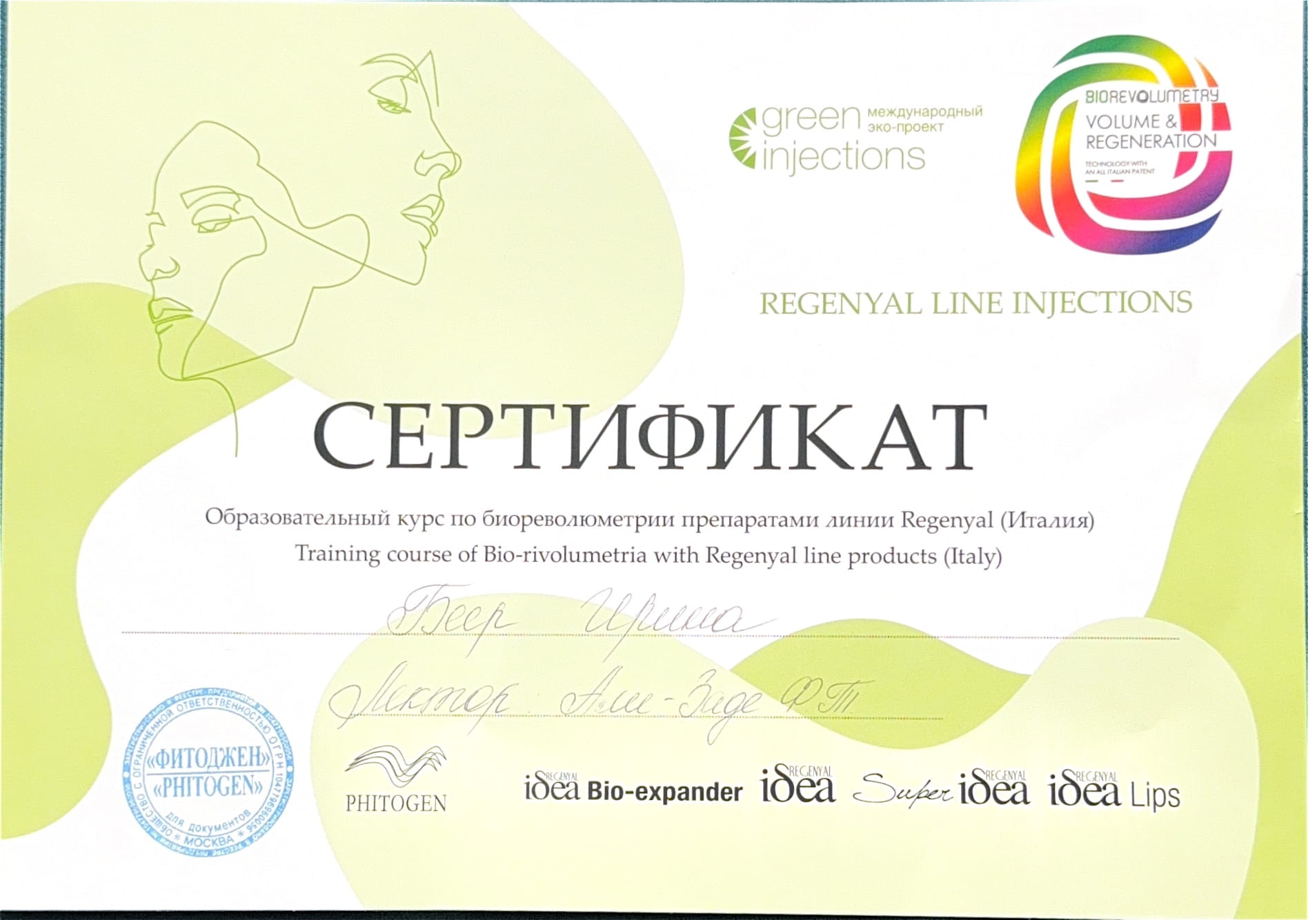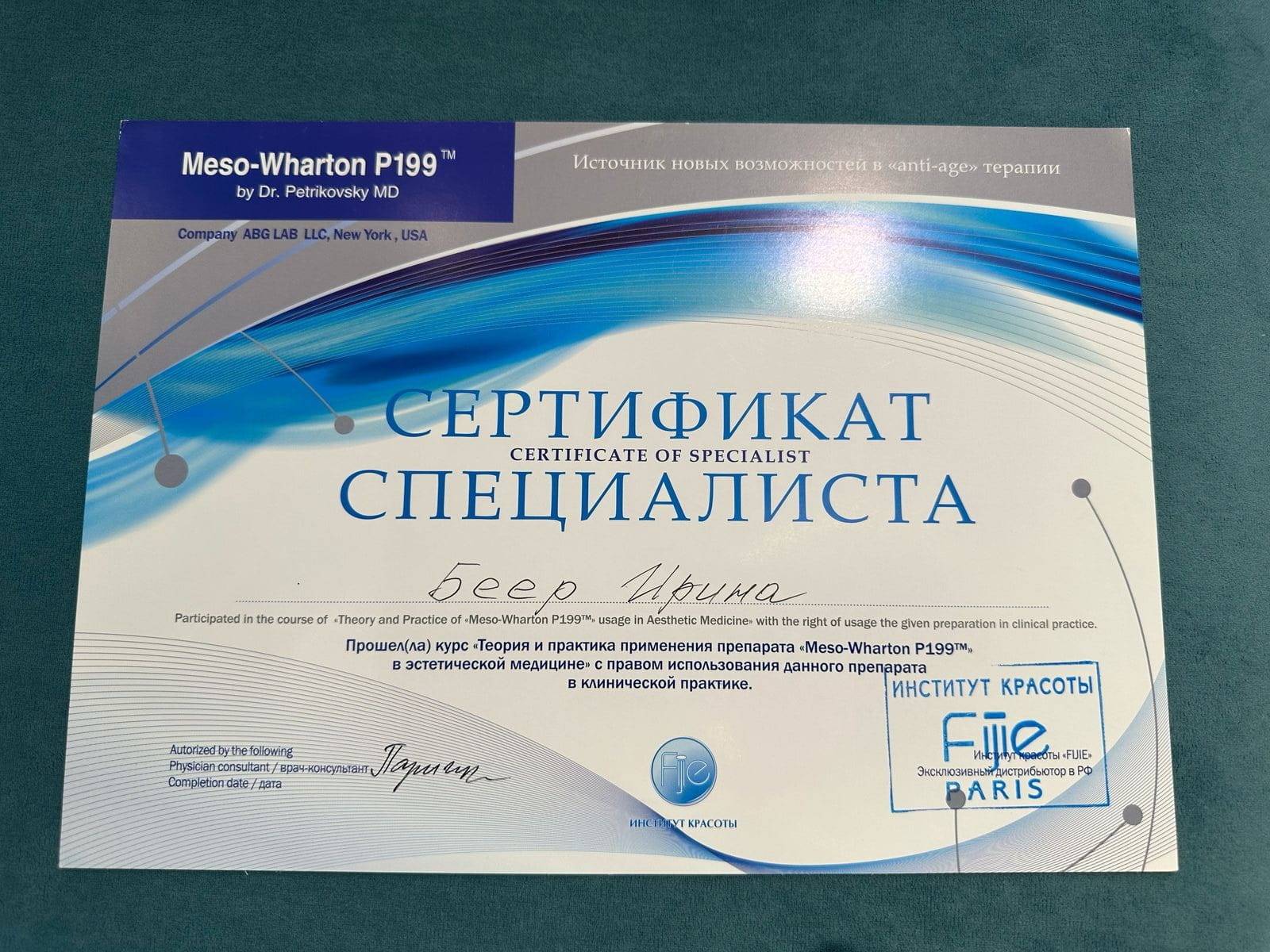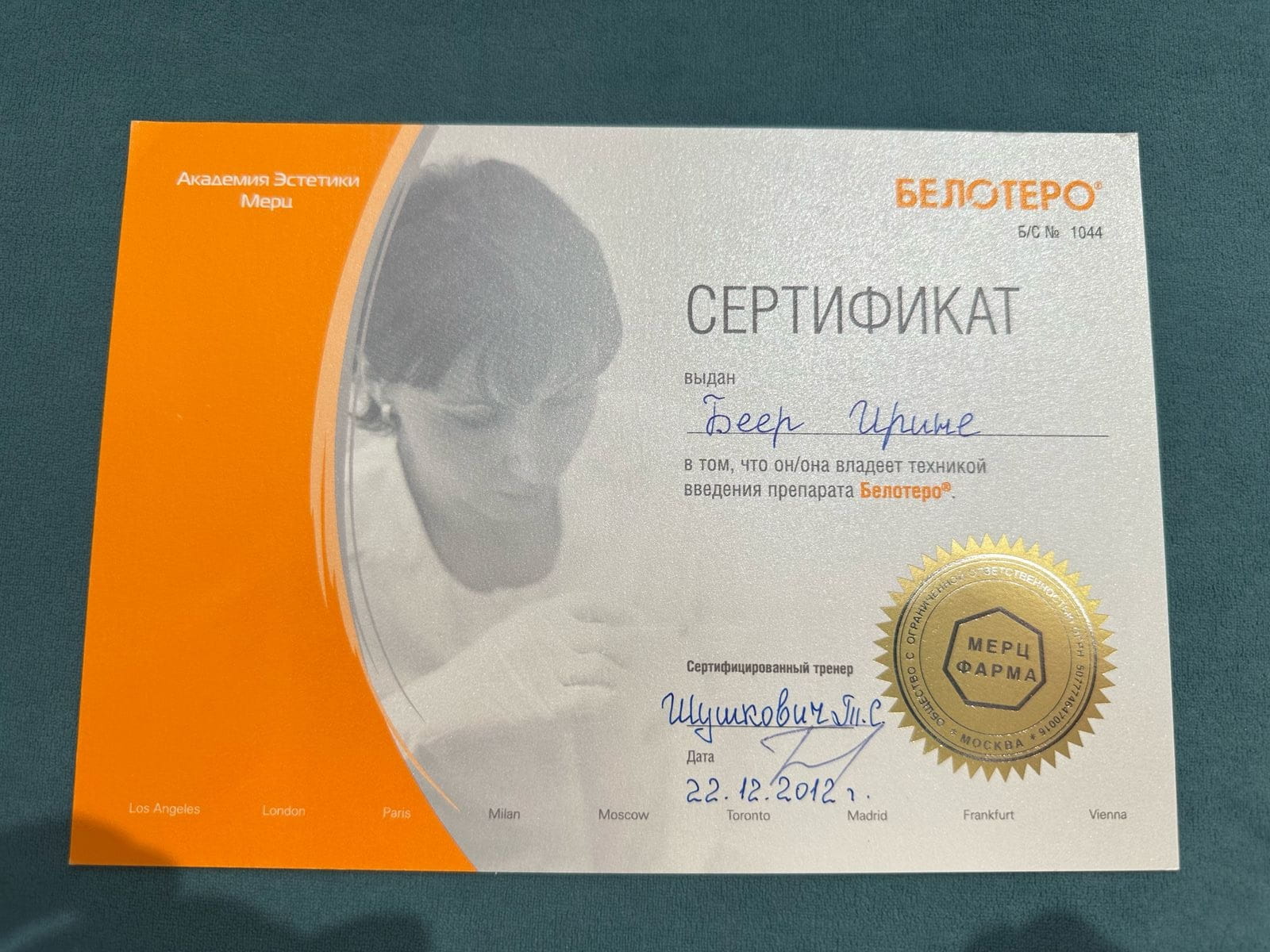 - "Косметология" , уникальный номер реестровой записи 7723 027475364 , место проведения ФГБОУ ДПО РМАНПО Минздрава России, срок действия 25.04.2028