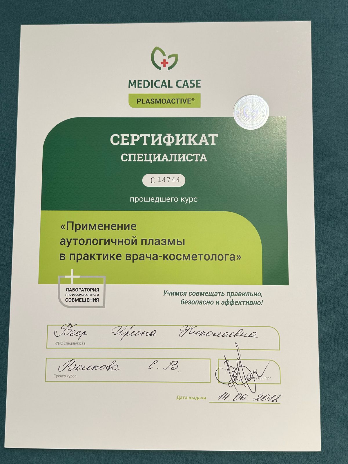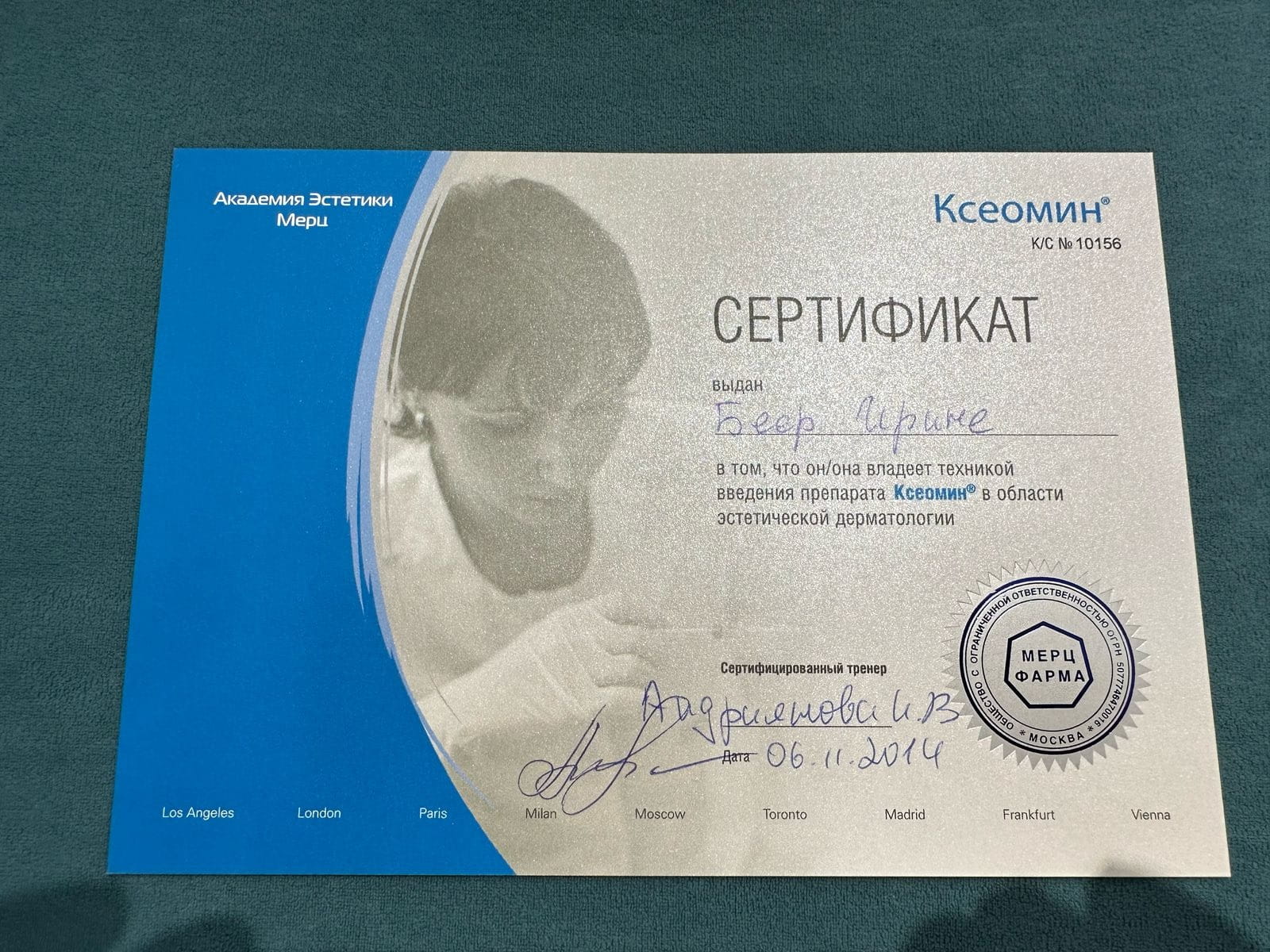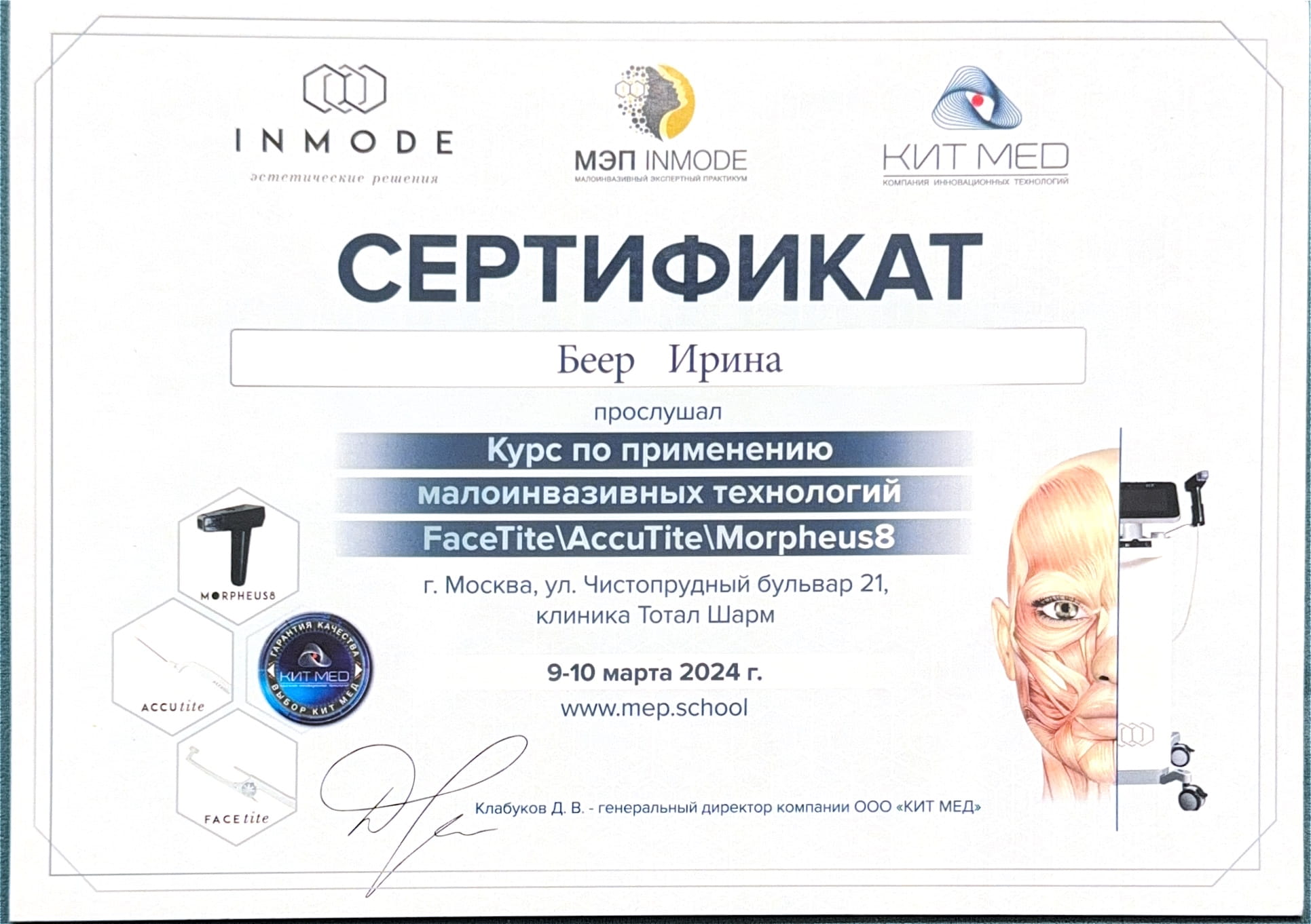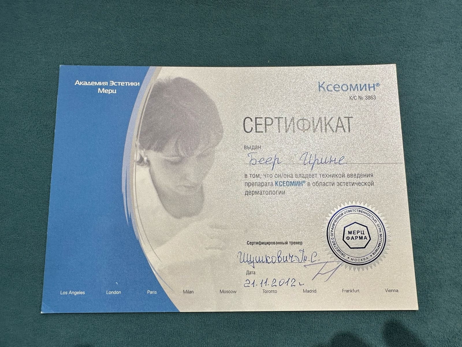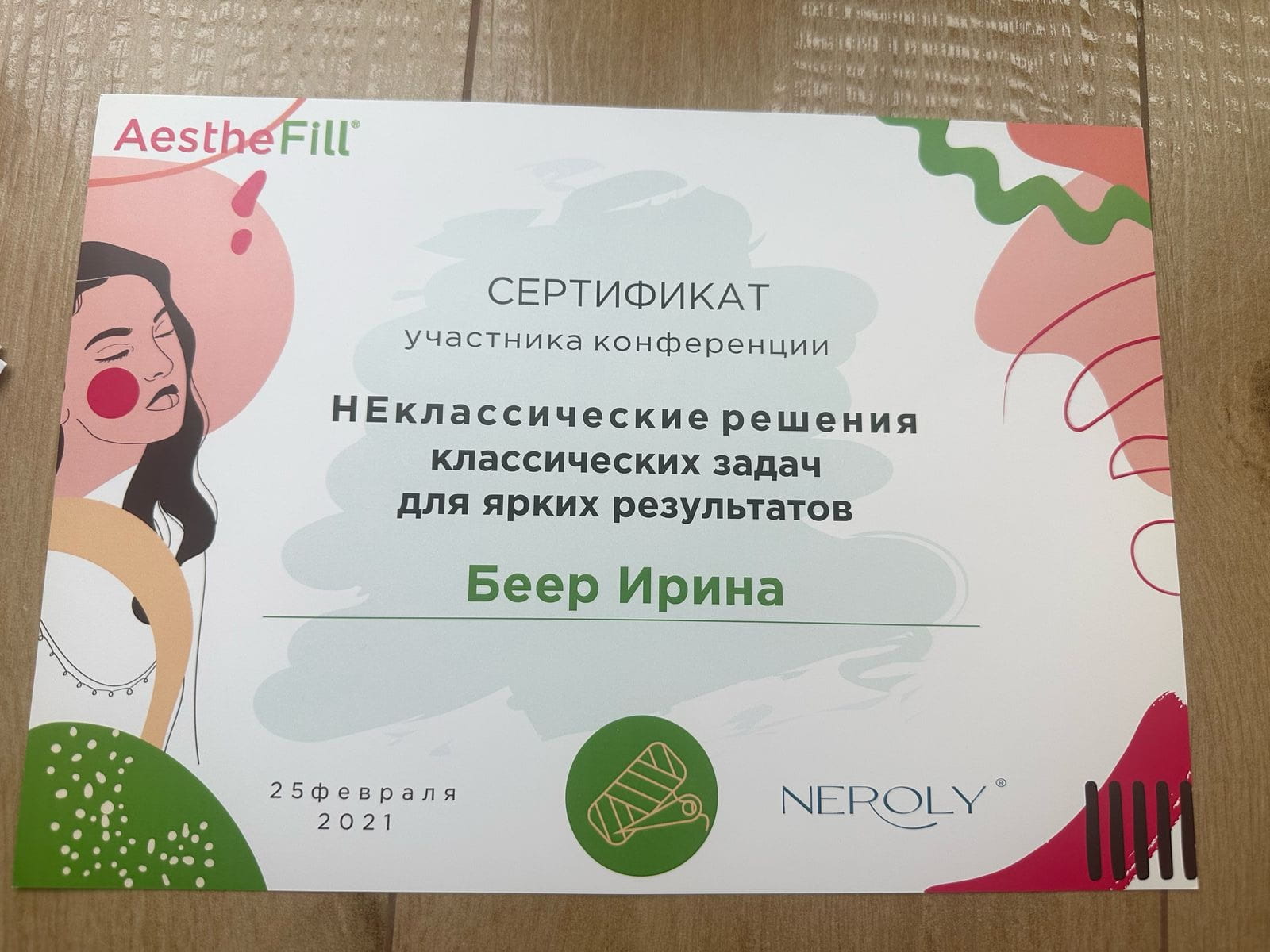 - "Косметология" , уникальный номер реестровой записи 7723 027475364 , место проведения ФГБОУ ДПО РМАНПО Минздрава России, срок действия 25.04.2028