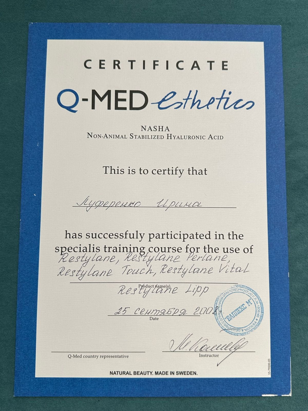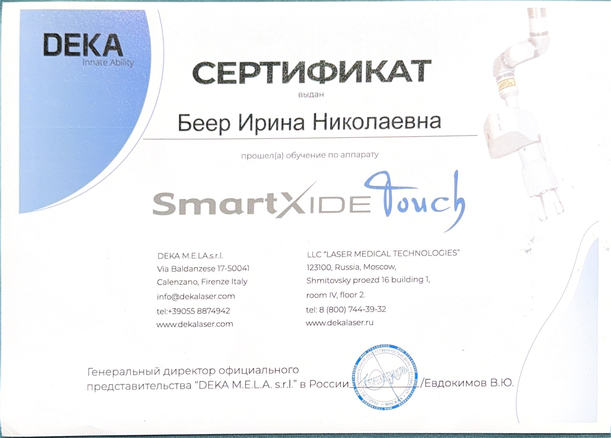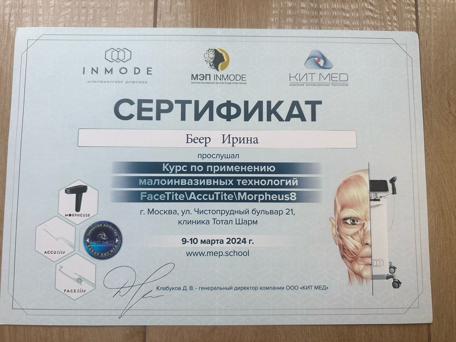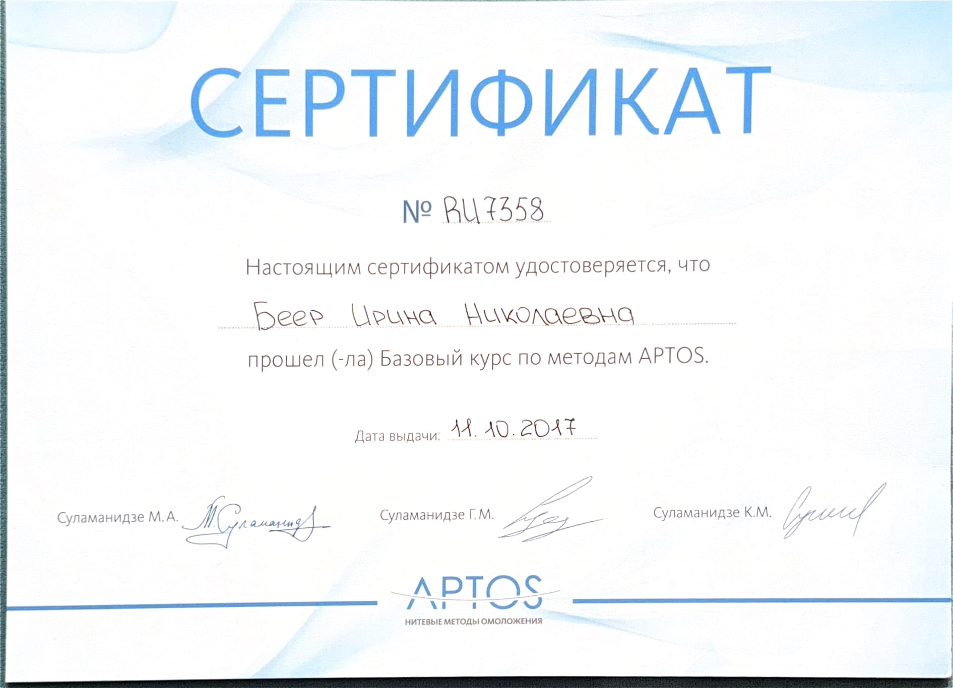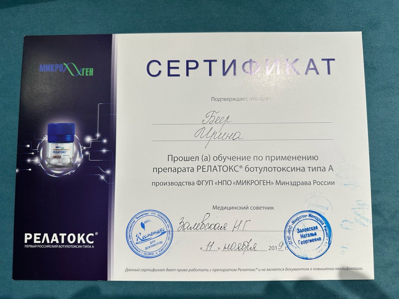 - "Косметология" , уникальный номер реестровой записи 7723 027475364 , место проведения ФГБОУ ДПО РМАНПО Минздрава России, срок действия 25.04.2028