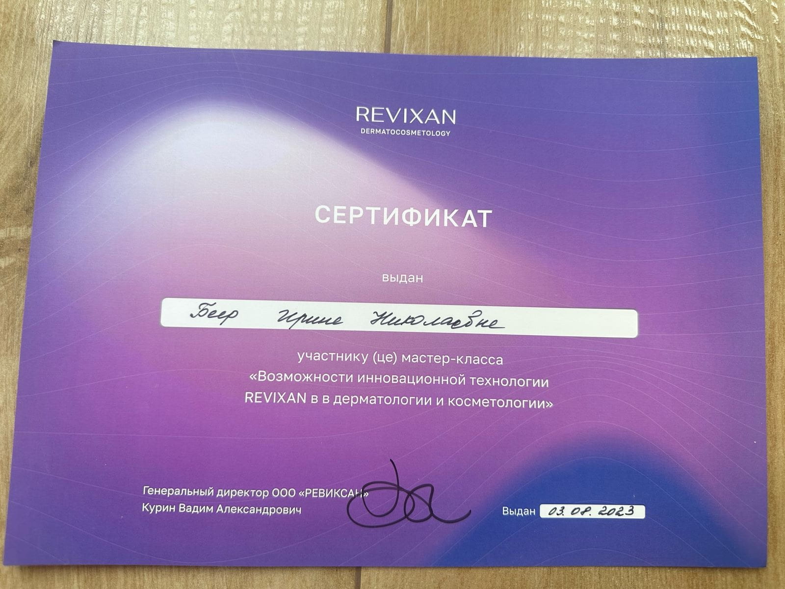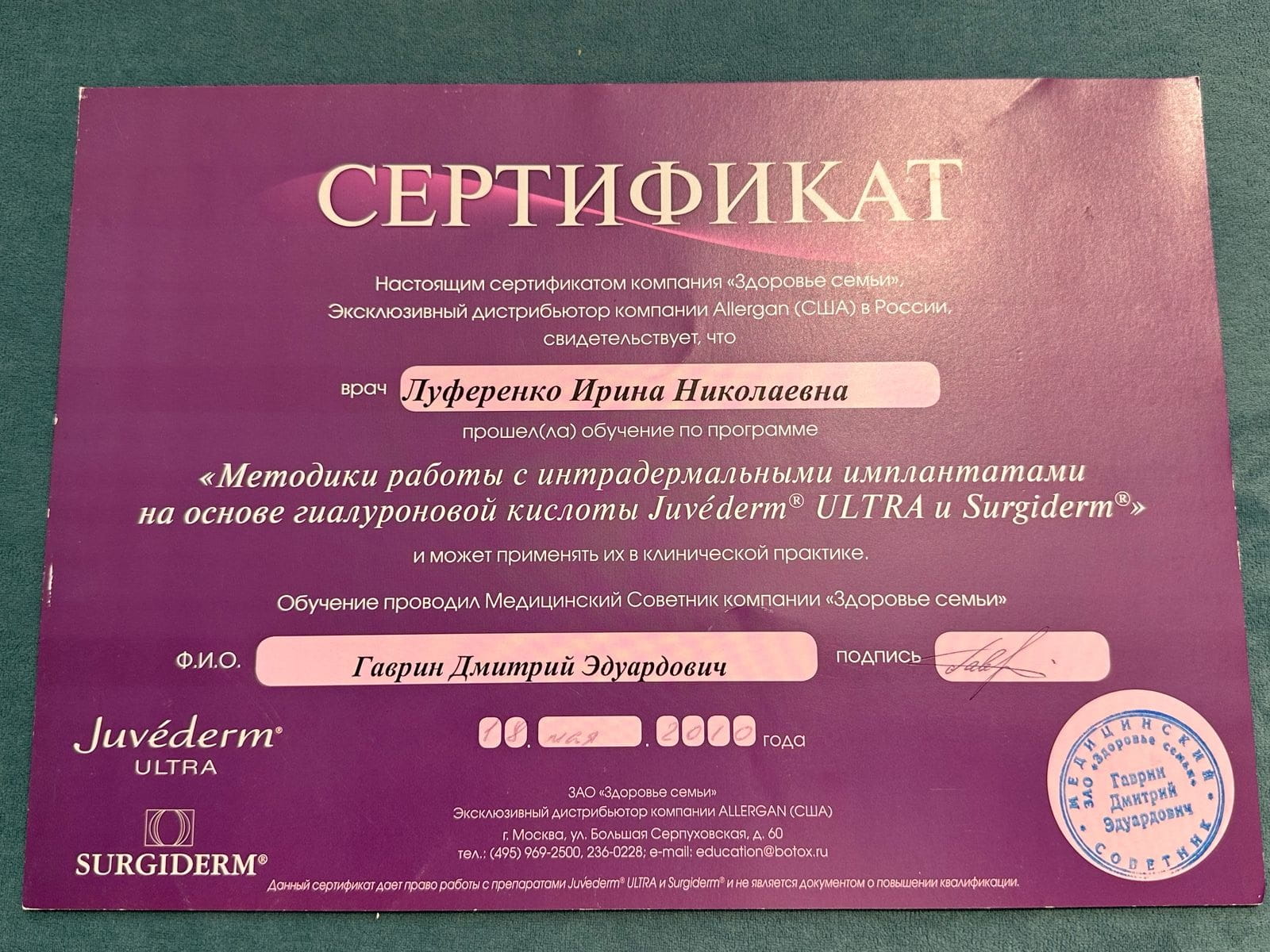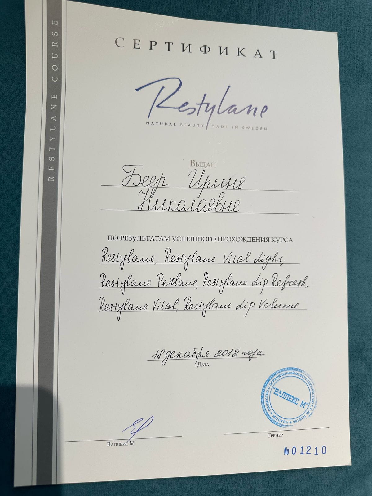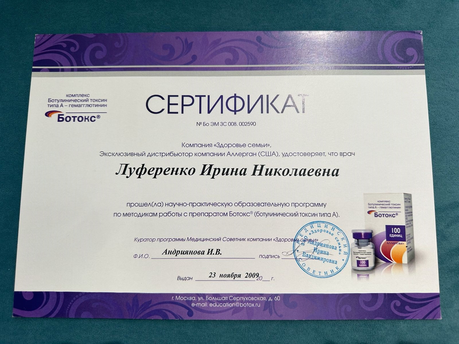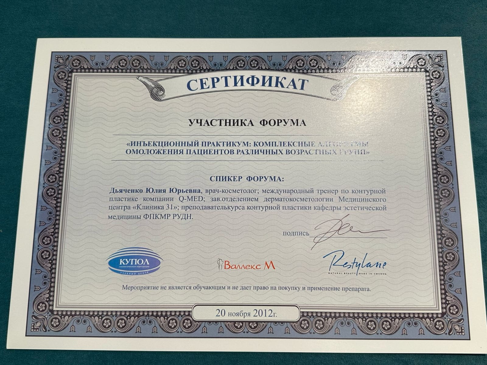 - "Косметология" , уникальный номер реестровой записи 7723 027475364 , место проведения ФГБОУ ДПО РМАНПО Минздрава России, срок действия 25.04.2028