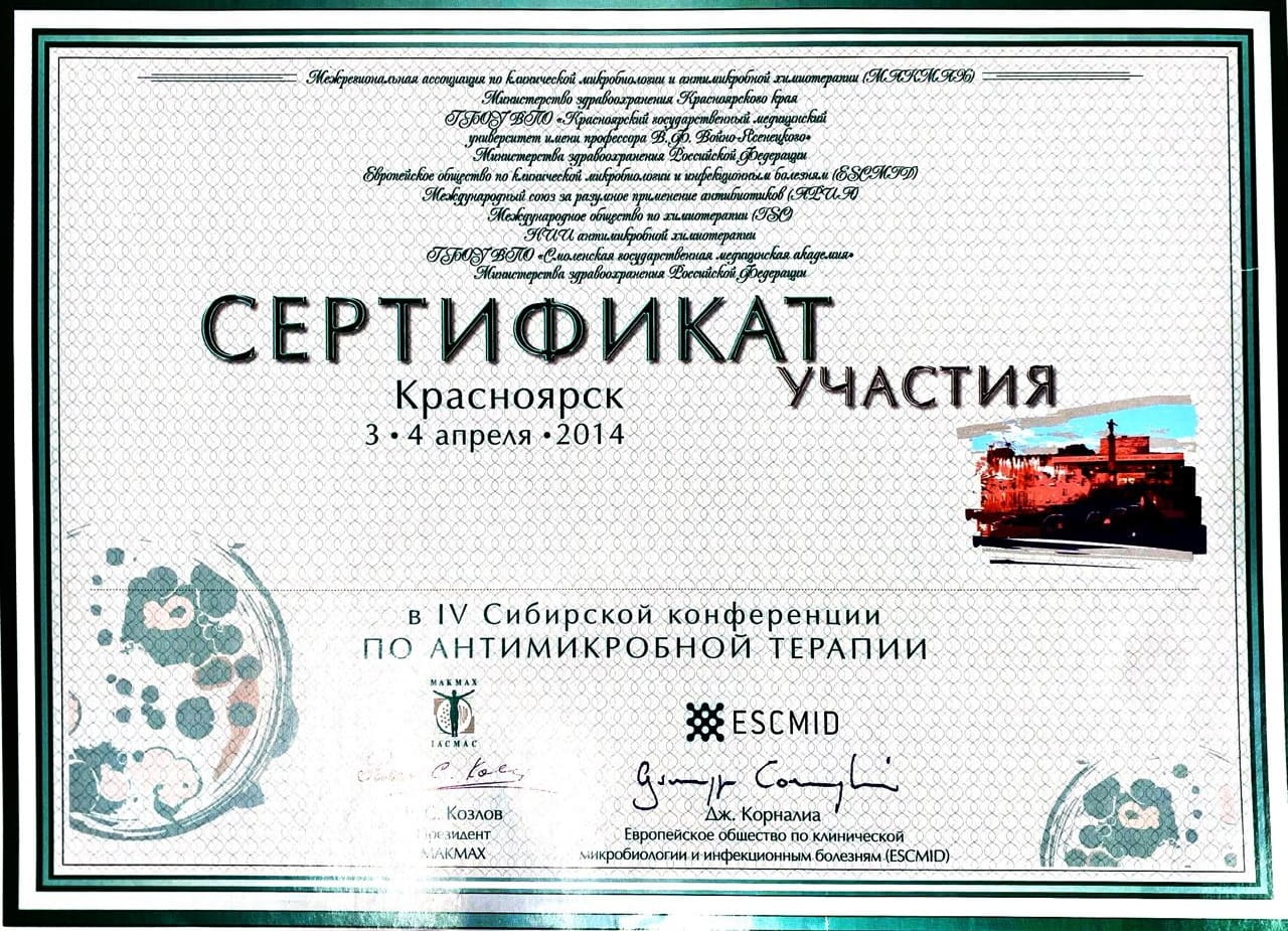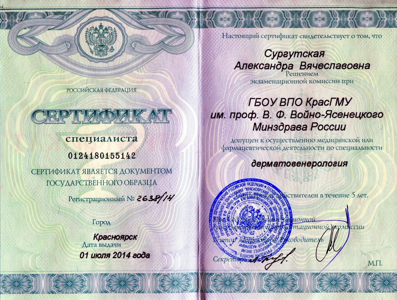 - Сертификат специалиста по специальности дерматовенерология №0124180155142 дата выдачи 01.07.2014