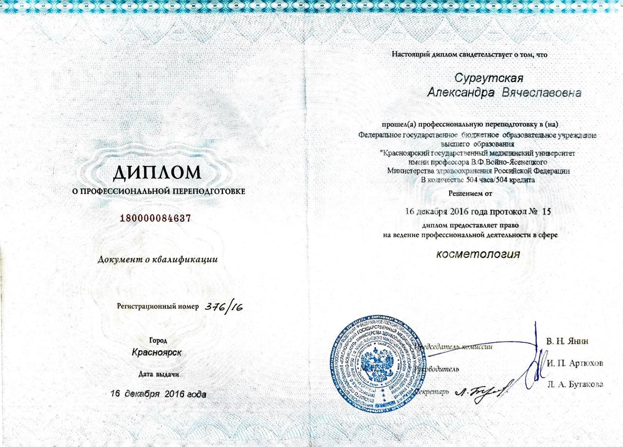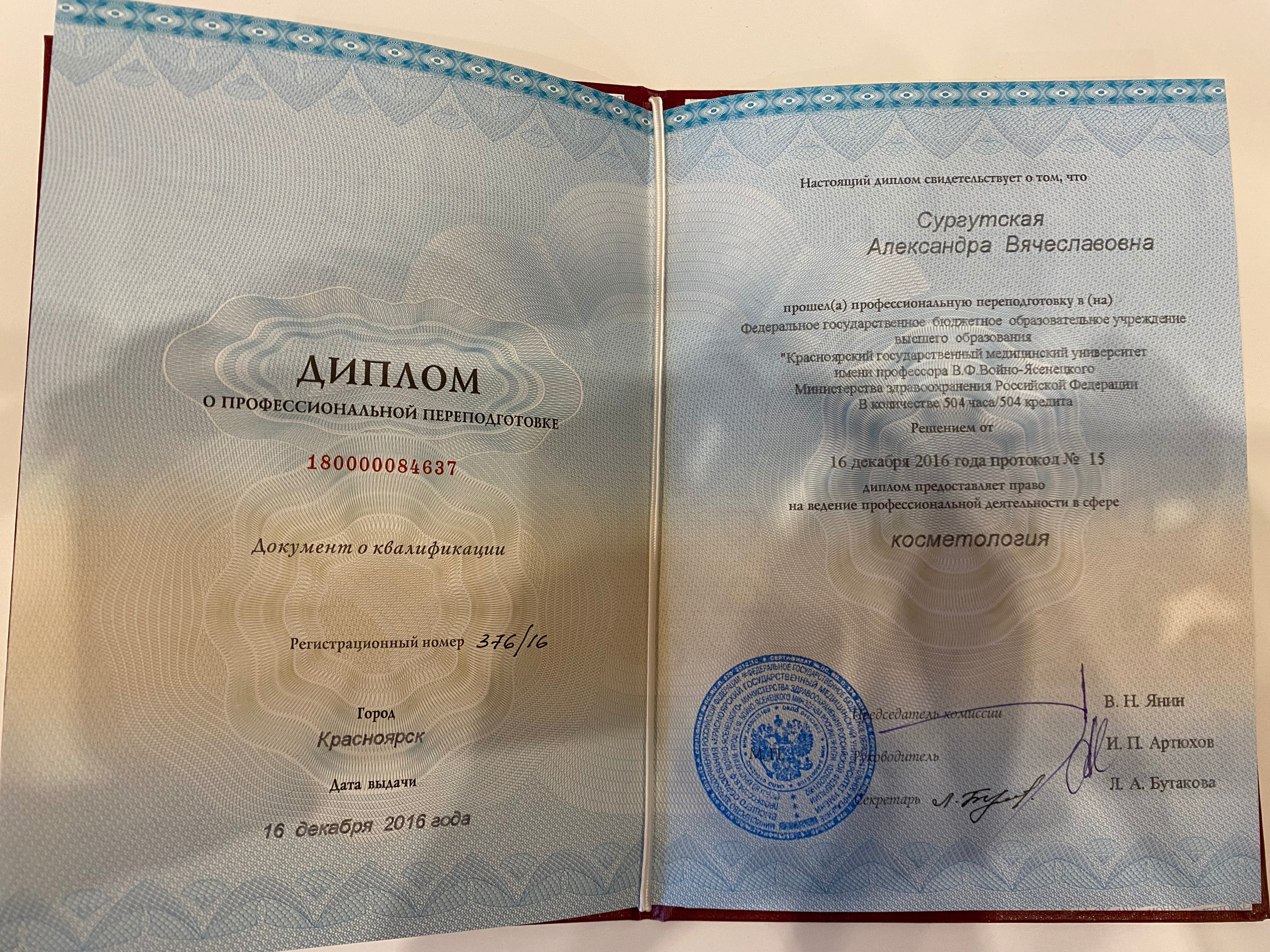 - Диплом о профессиональной переподготовке по программе «Косметология» №180000084637 дата выдачи 16.12.2016