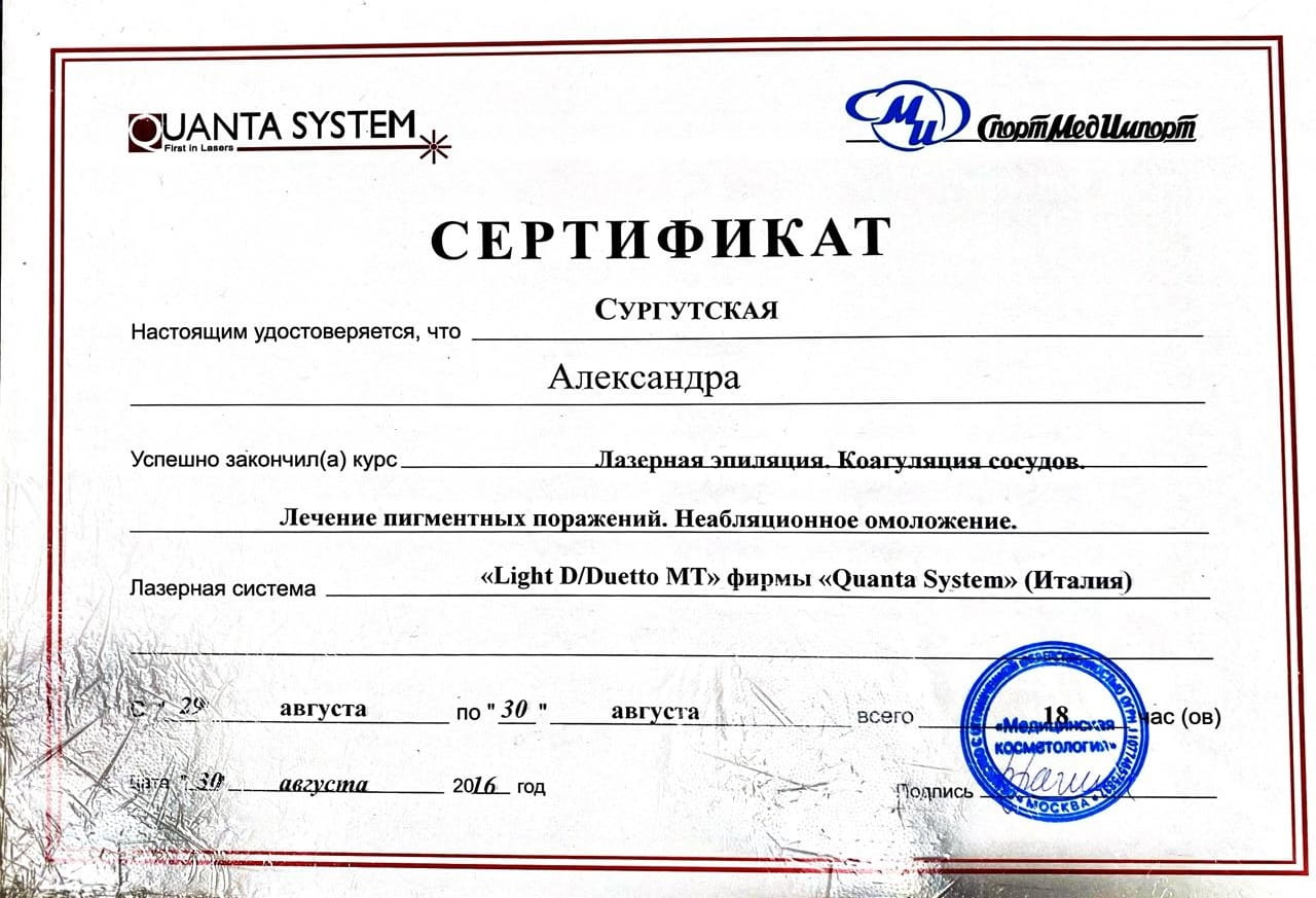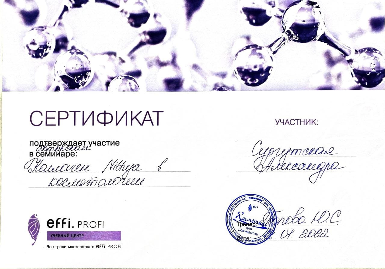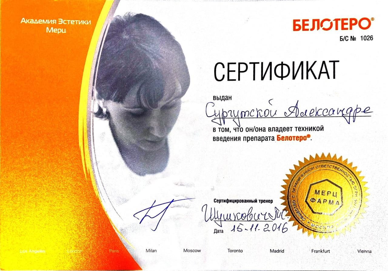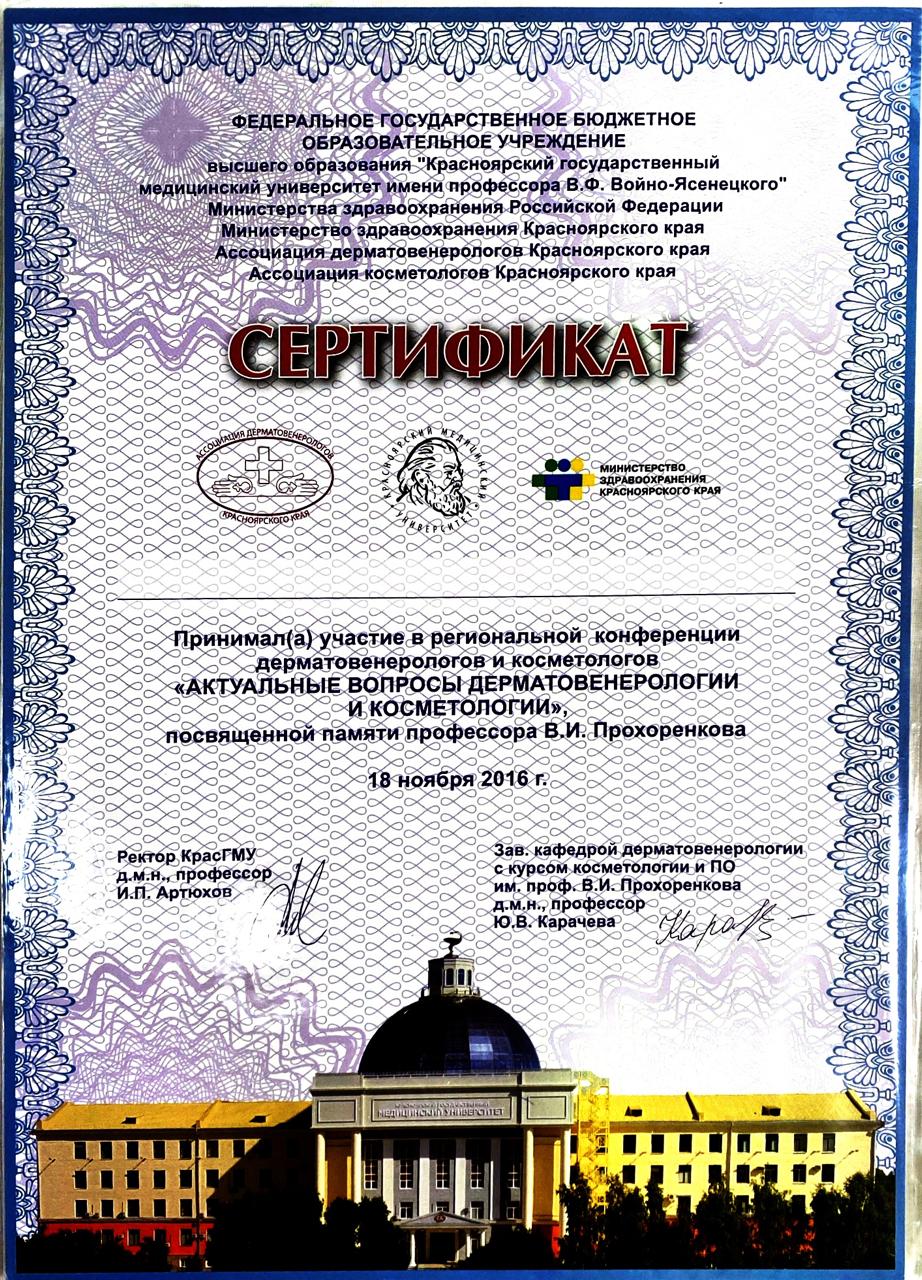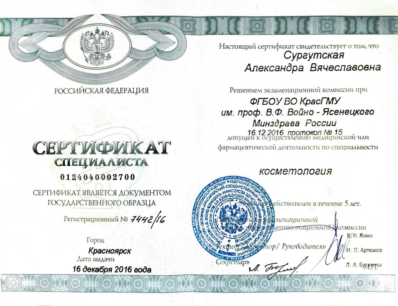 - Сертификат специалиста по специальности «Косметология» №0124040002700 дата выдачи 16.12.2016