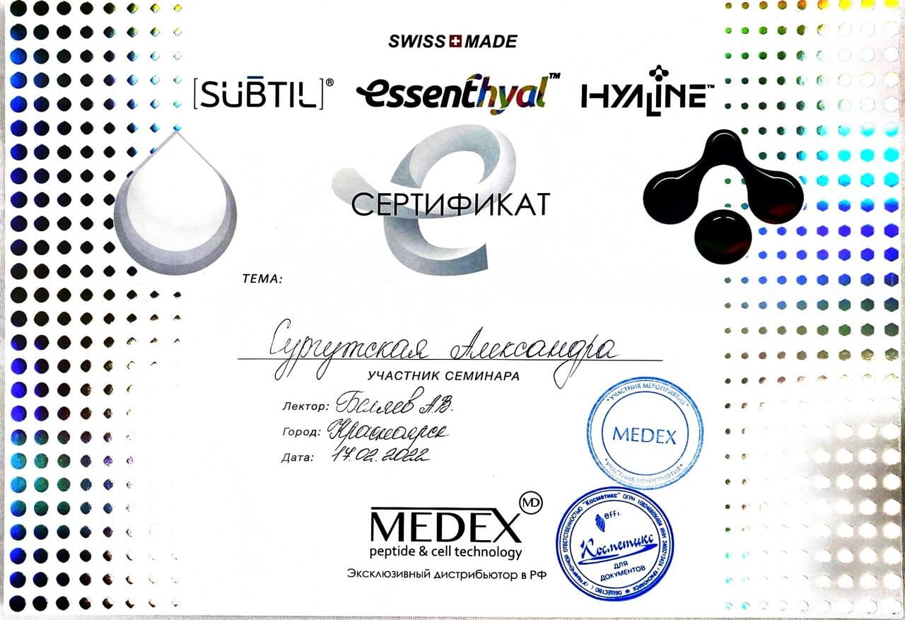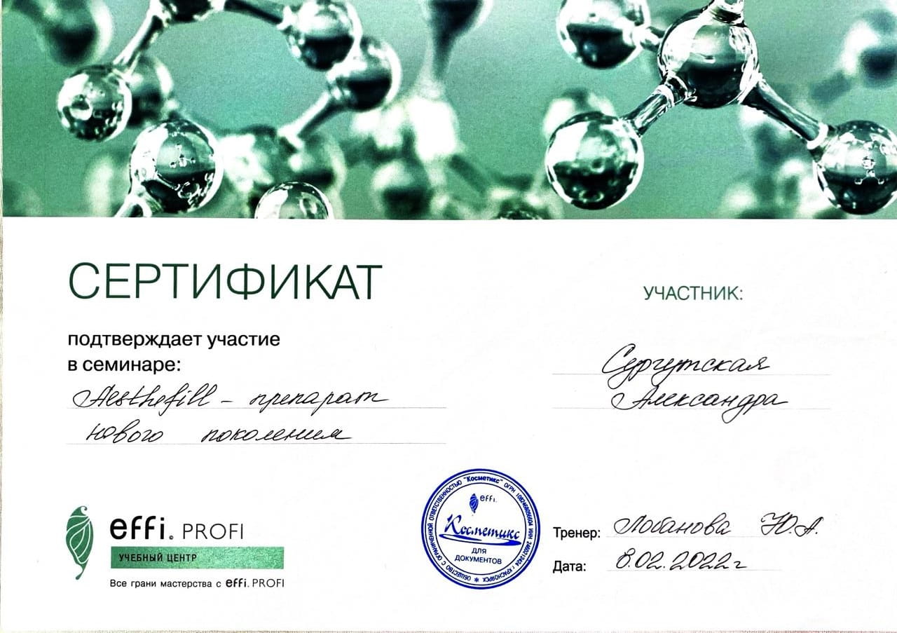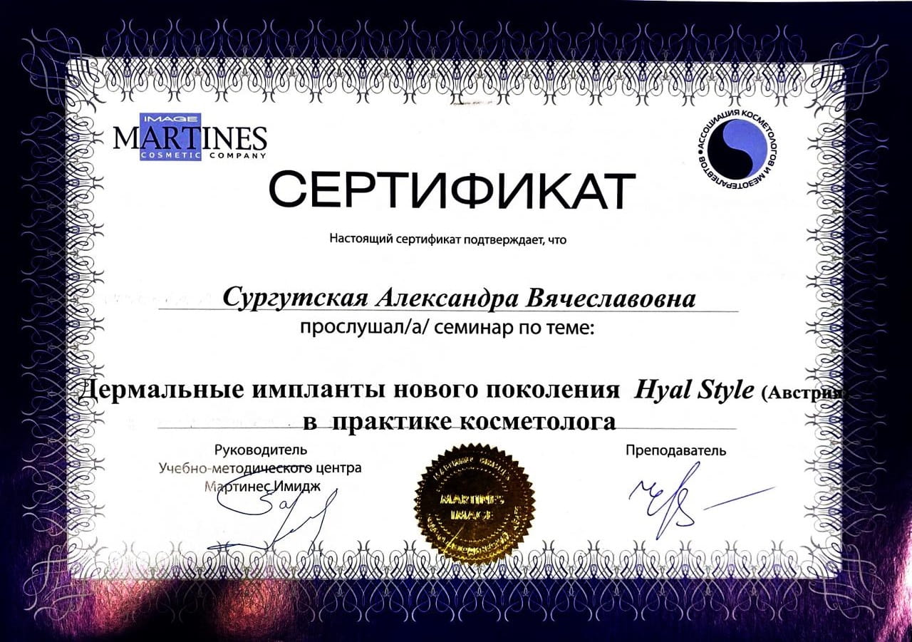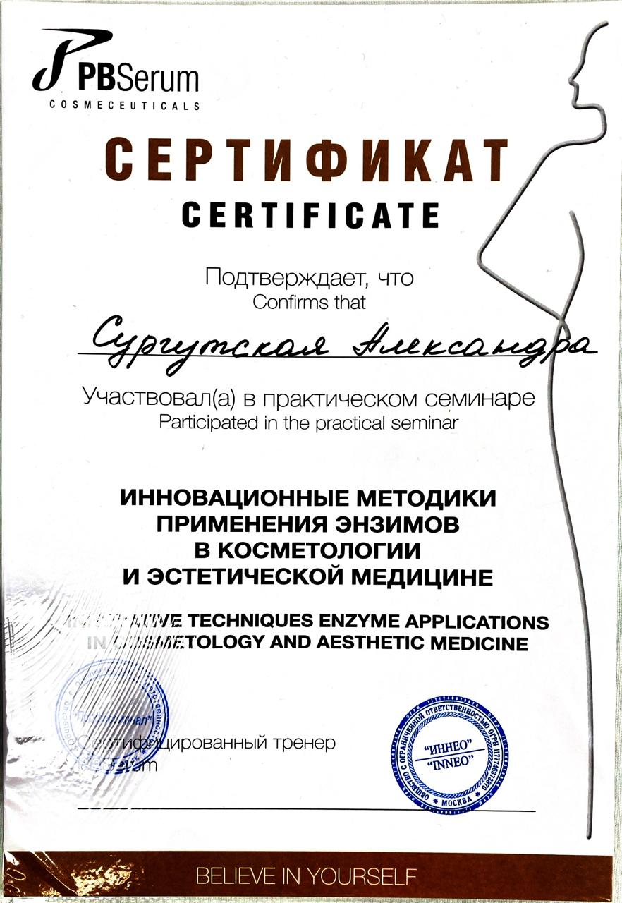 - Сертификат специалиста по специальности «Косметология» №0124040002700 дата выдачи 16.12.2016