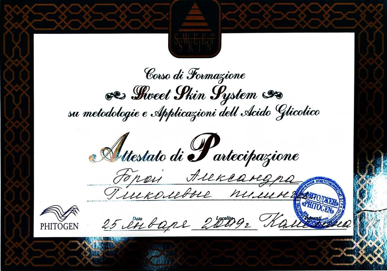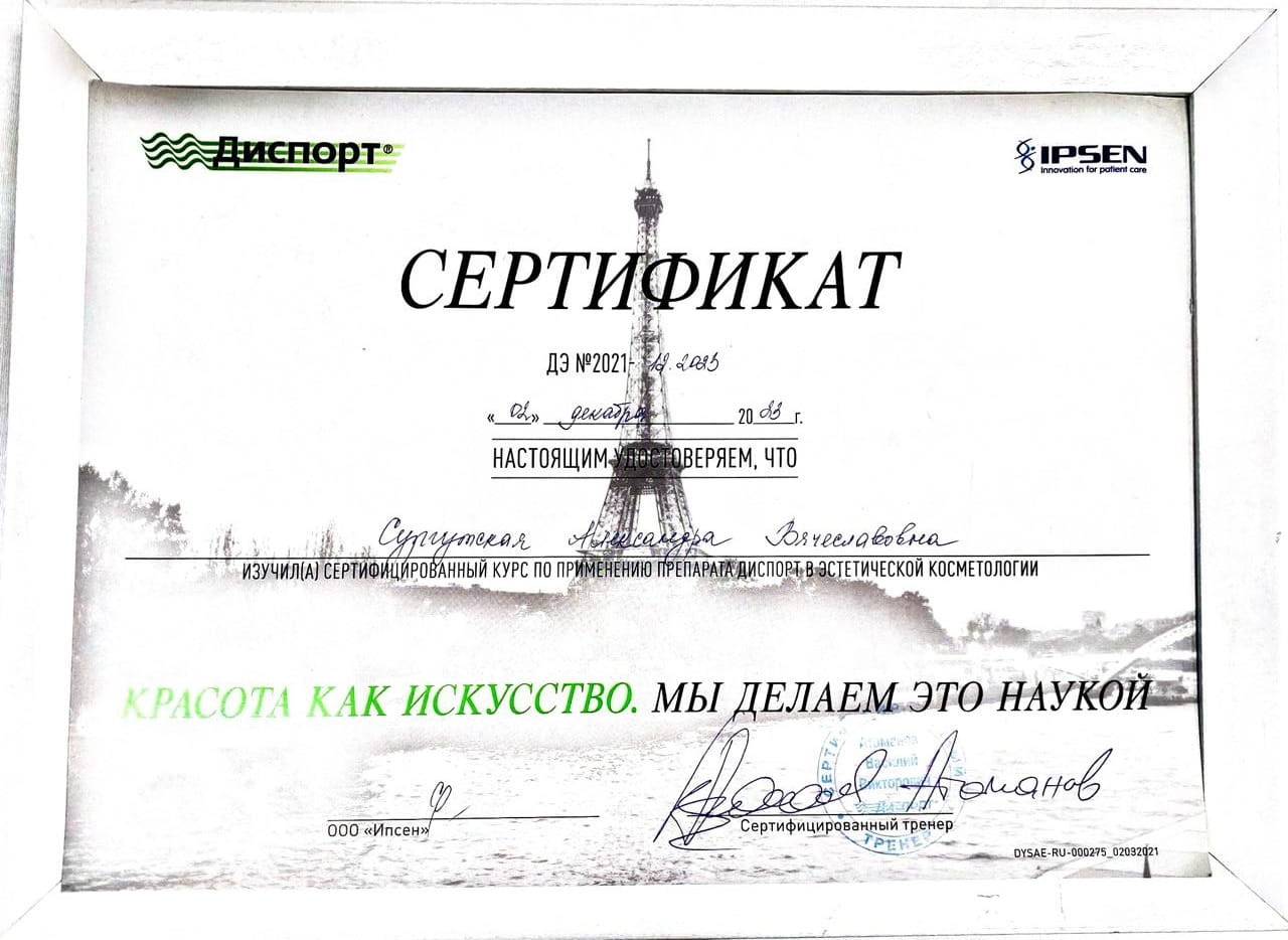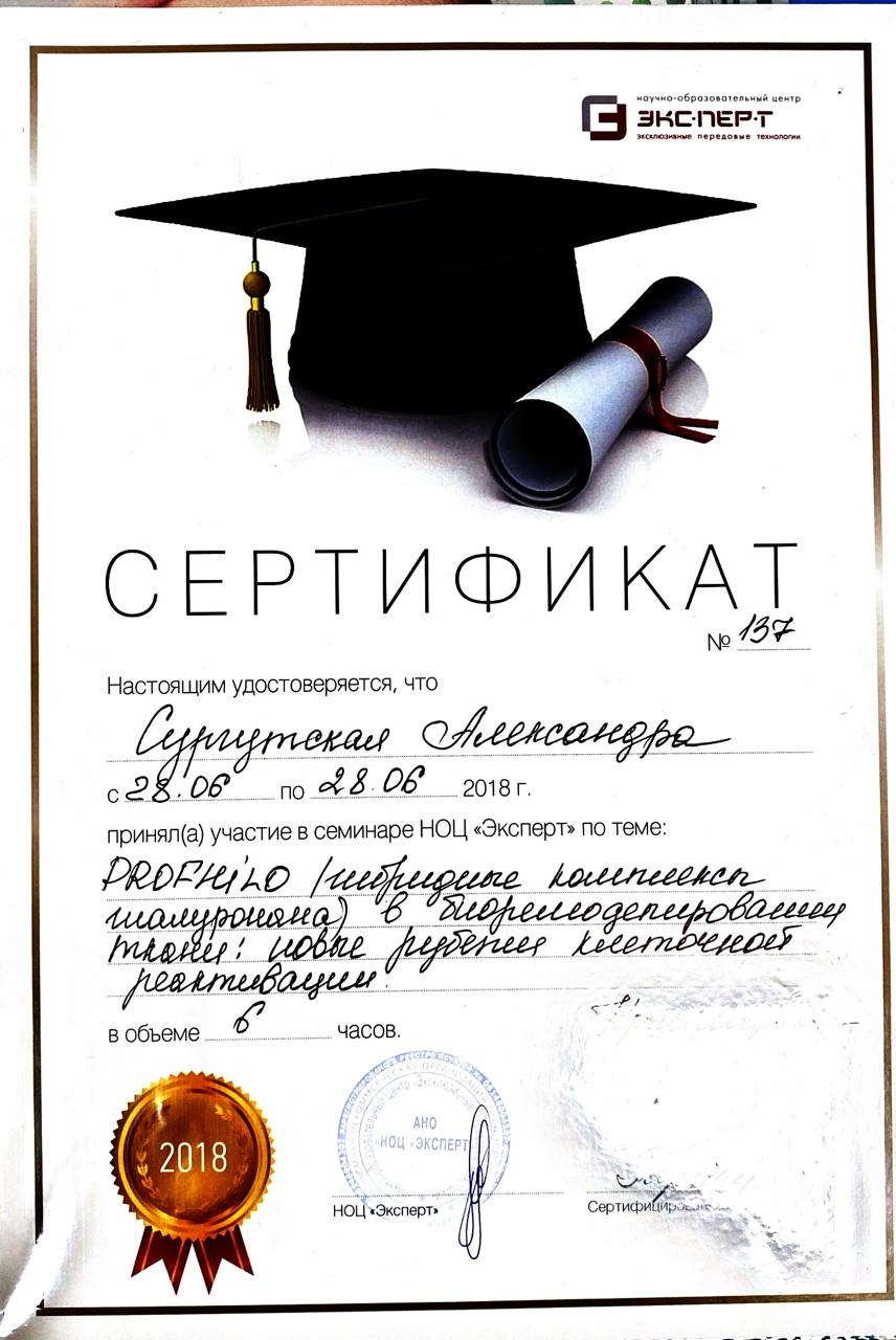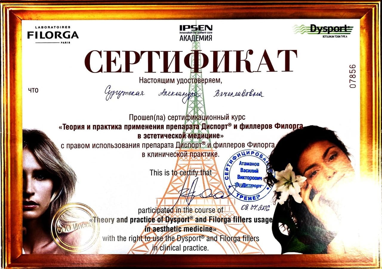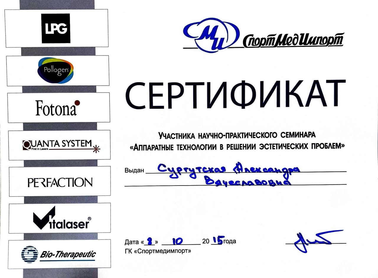 - Сертификат специалиста по специальности «Косметология» №0124040002700 дата выдачи 16.12.2016