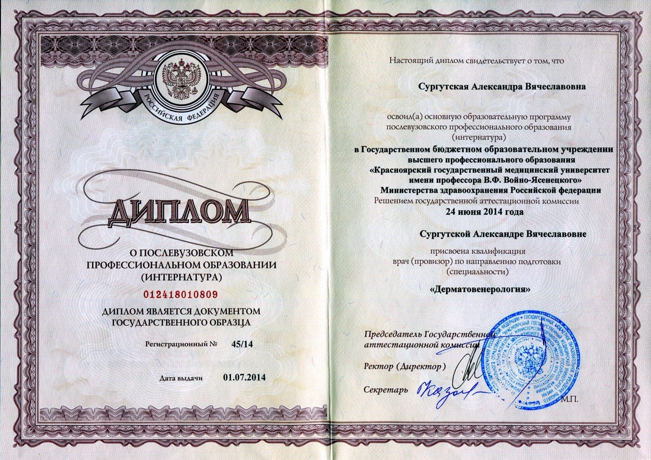 - Интернатура по специальности «Дерматовенерология» № 012418010809 дата выдачи 01.07.2014