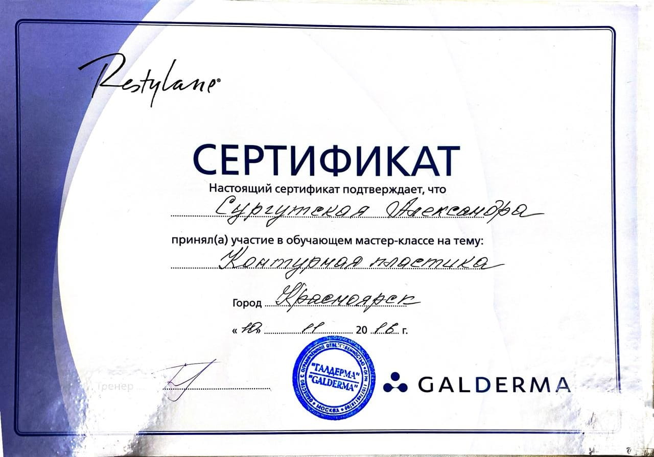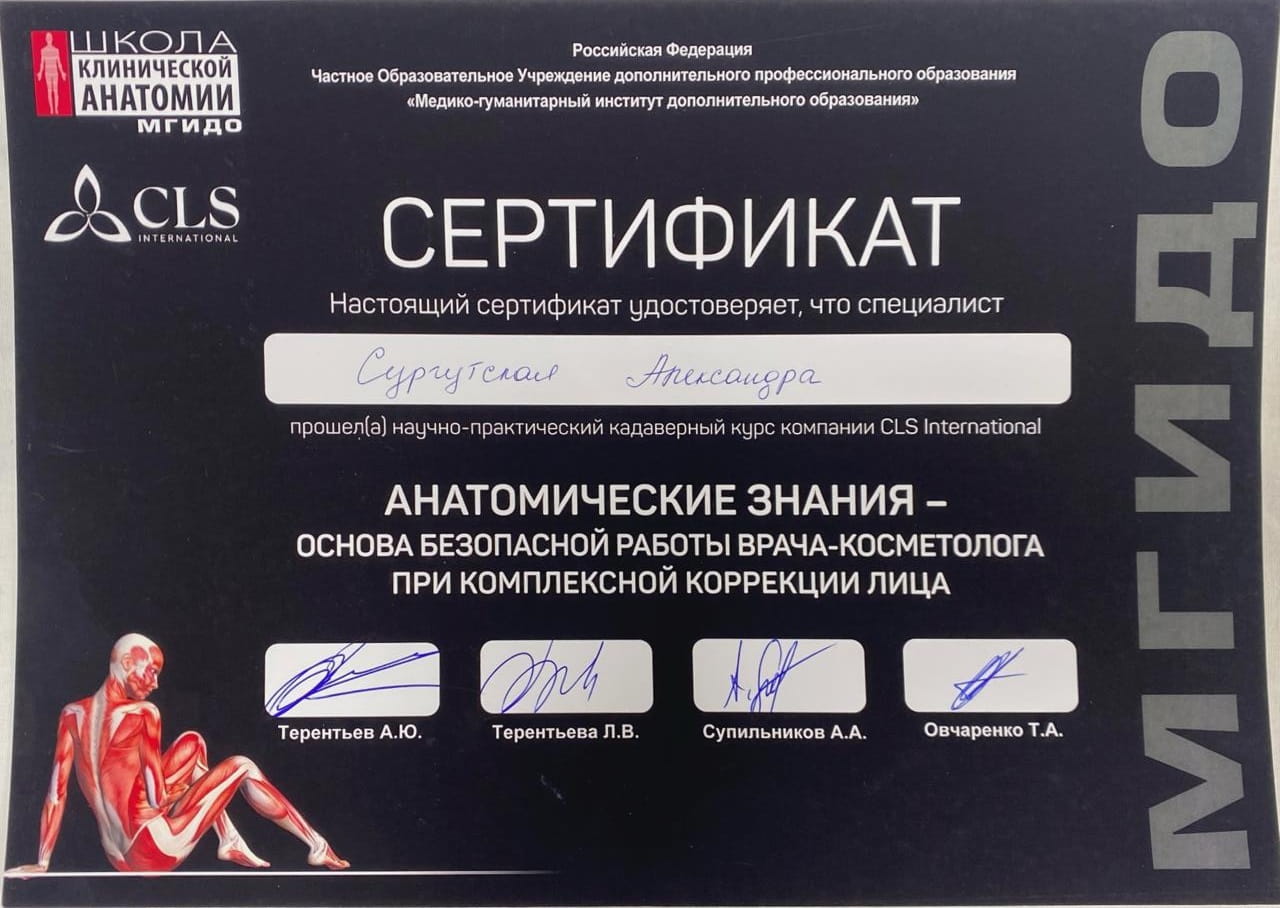 - Сертификат: "Косметология" , уникальный номер реестровой записи7724 031742510, место проведения ФГБОУ ДПО РМАНПО Минздрава России, срок действия 27.02.2029