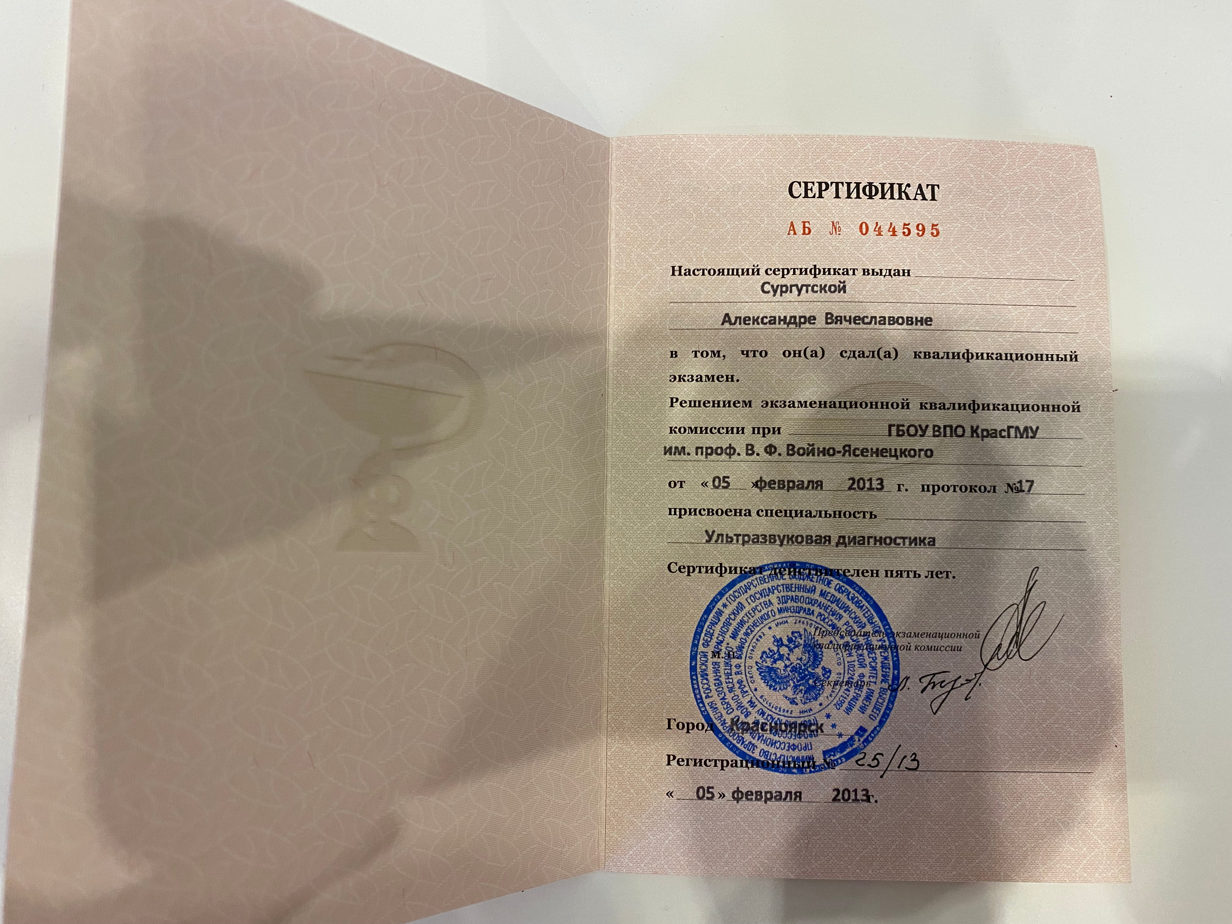 - 2013г - Диплом о профессиональной переподготовки по программе «ультразвуковая диагностика»