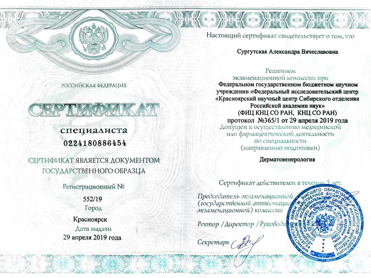 - Сертификат специалиста по специальности дерматовенерология №0224180886454 дата выдачи 29.03.2019