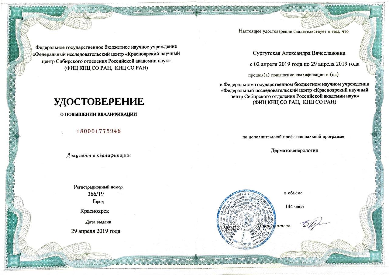 - Удостоверение о повышении квалификации по дополнительной профессиональной программе «Дерматовенерология» 144ч. (02.03.2019-29.03.2019)